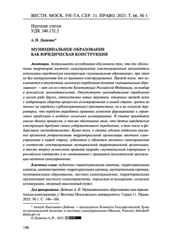 Актуальность исследования обусловлена тем, что для обозначения территорий местного самоуправления конституционный законодатель использовал юридическую конструкцию «муниципальное образование», при этом не дав инструментов для их правового конструирования. Прежде всего, это заключается в отсутствии легального определения понятия «муниципальное образование» - нет его не в тексте Конституции Российской Федерации, не вообще в российском законодательстве. Отсутствует законодательное определение и целого ряда других, относительно новых терминов, связанных прежде всего с набирающим обороты процессом агломерирования в нашей стране, причем не только на городских (урбанизированных) пространствах, но и на сельской территории, что требует выработки правовых аспектов формирования и управления городскими и особенно сельскими агломерациями. В статье приводится анализ данных процессов, а также обоснование того, что данные юридические конструкции требуют своего содержательного определения, в том числе в федеральном законодательстве. Кроме того, в статье уделено отдельное внимание временной ретроспективе территориальной организации местного самоуправления в нашей стране, субъектам и объектам местного самоуправления в контексте конструирования муниципальной территориальной организации, а также вопросу осмысления правовой природы «муниципальной корпорации» в российском контексте и ее соотношению с принципом поселенческой организации местного самоуправления.