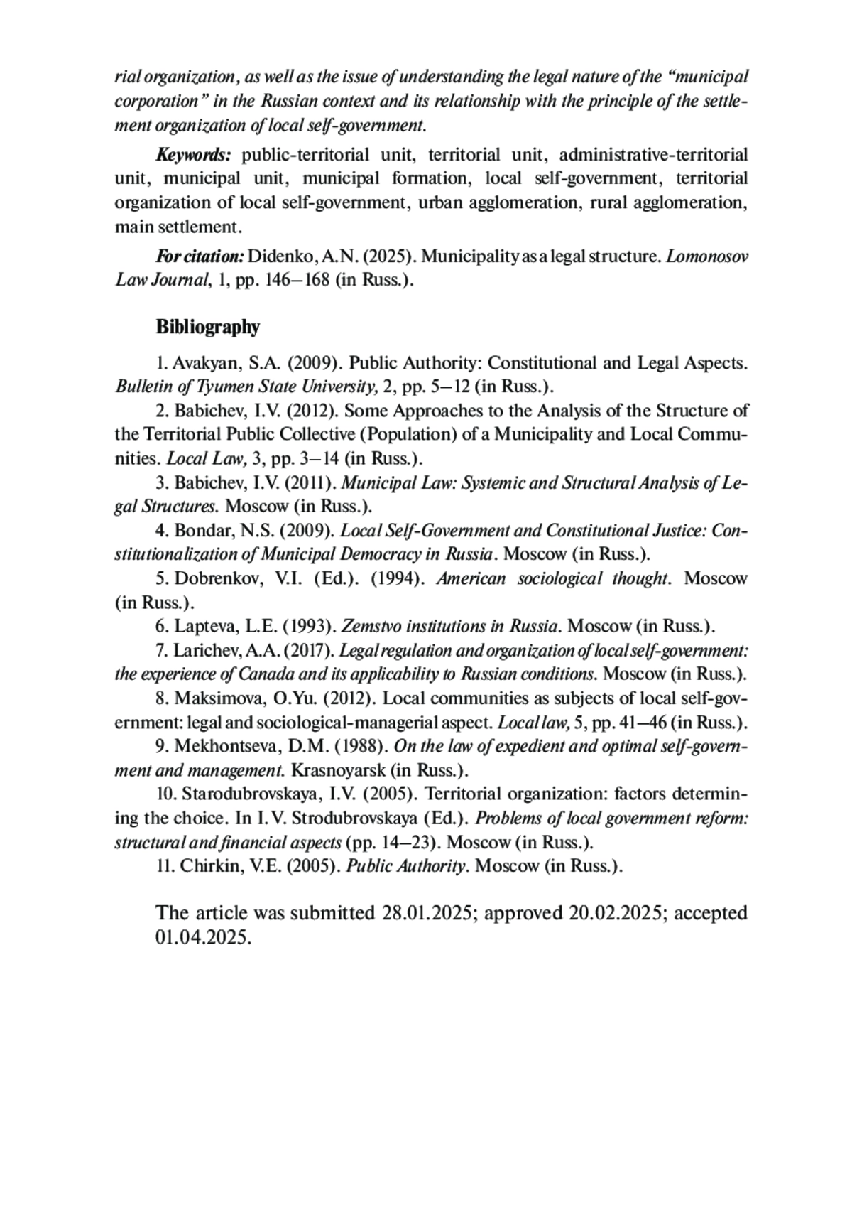 7. Ларичев А. А. Правовое регулирование и организация местного самоуправления: опыт Канады и его применимость в российских условиях. М., 2017. EDN: YVMQQX