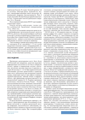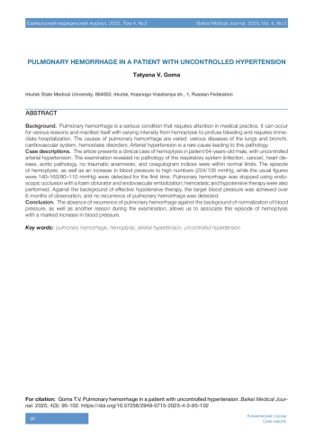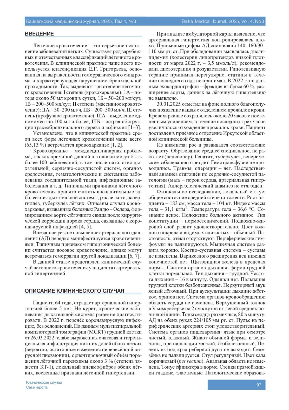 Введение. Лёгочное кровотечение – это серьёзное состояние, требующее внимания в медицинской практике. Оно может возникать по разным причинам и проявляться с различной интенсивностью – от кровохарканья до профузного кровотечения – и требует немедленной госпитализации. Причины лёгочного кровотечения многообразны: различные заболевания лёгких и бронхов, сердечно-сосудистой системы, нарушения гемостаза. Артериальная гипертензия является редкой причиной, приводящей к данной патологии.