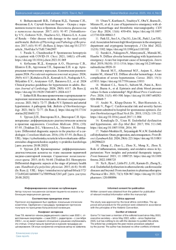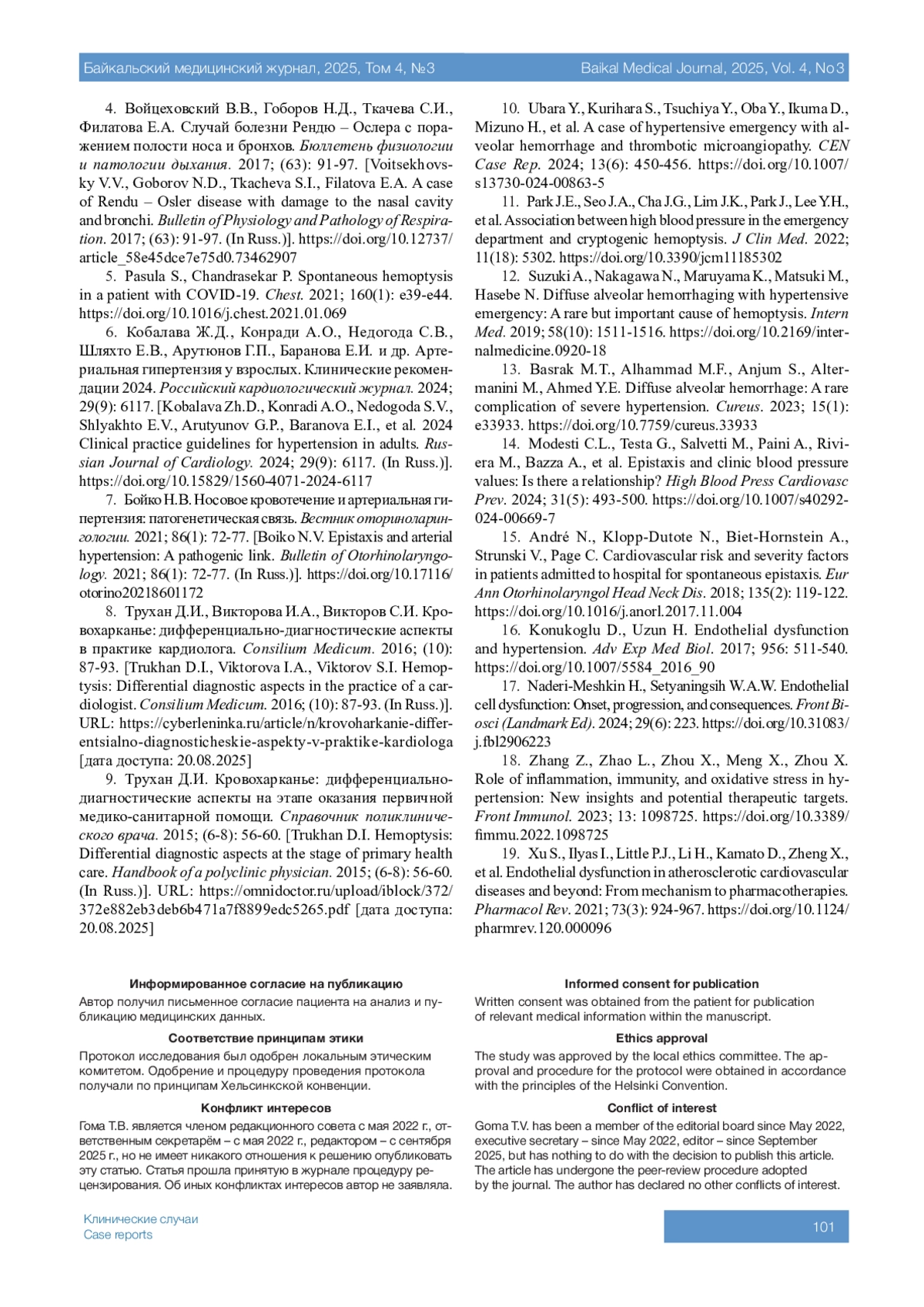 7. 	Бойко Н.В. Носовое кровотечение и артериальная гипертензия: патогенетическая связь. Вестник оториноларингологии. 2021;86(1):72-77. DOI: 10.17116/otorino20218601172