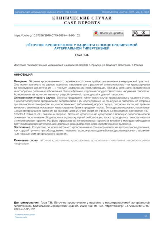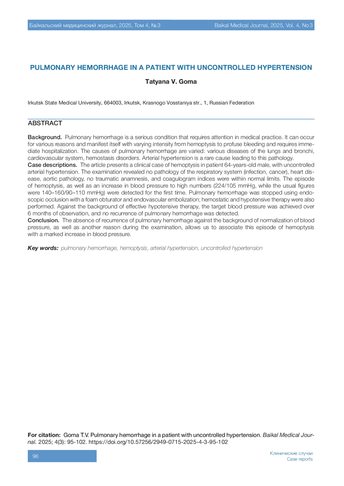 Описание клинического случая. В статье представлен клинический случай кровохарканья у пациента 64 лет, с неконтролируемой артериальной гипертензией. При обследовании не обнаружено патологии со стороны дыхательной системы (инфекции, онкологического заболевания), порока сердца, патологии аорты, нет травматического анамнеза; показатели коагулограммы были в пределах нормы. Эпизод кровохарканья, как и повышение артериального давления до высоких цифр 224/105 мм рт. ст. (привычные показатели составляли 140– 160/90–110 мм рт. ст.), выявлены впервые. Лёгочное кровотечение купировано с помощью эндоскопической окклюзии поролоновым обтуратором и эндоваскулярной эмболизации, также проводились гемостатическая и гипотензивная терапия. На фоне эффективной гипотензивной терапии в течение 6 месяцев наблюдения достигнуто целевое артериальное давление, рецидивов лёгочного кровотечения не выявлено.