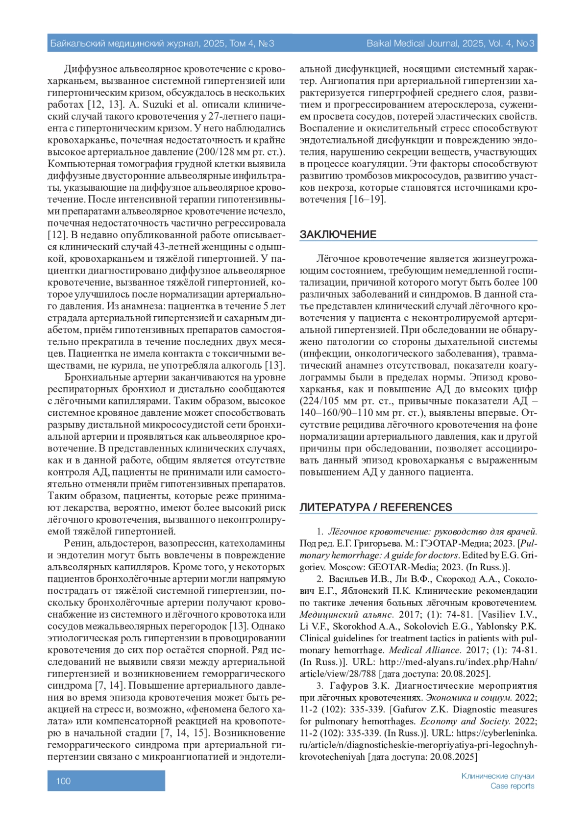 12. 	Suzuki A., Nakagawa N., Maruyama K., Matsuki M., Hasebe N. Diffuse Alveolar Hemorrhaging with Hypertensive Emergency: A Rare but Important Cause of Hemoptysis. Intern. Med. 2019;58:1511-1516. DOI: 10.2169/internalmedicine.0920-18