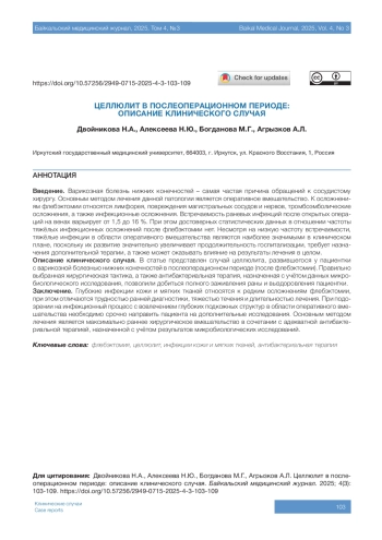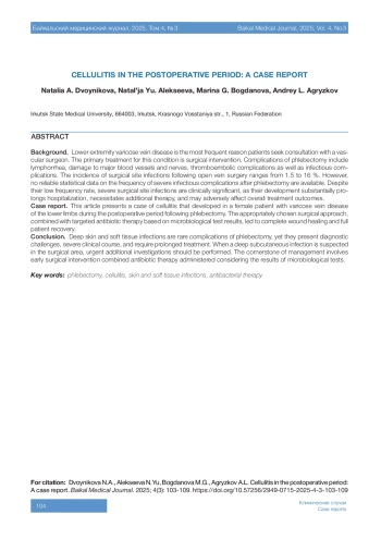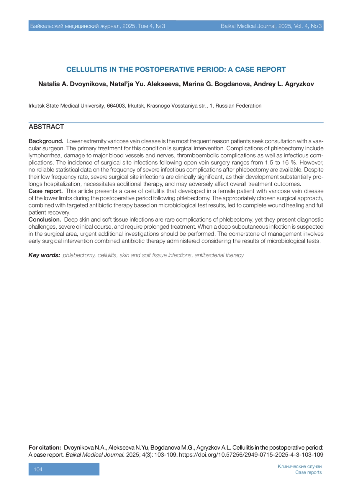 ДВОЙНИКОВА Н. А., АЛЕКСЕЕВА Н. Ю., БОГДАНОВА М. Г., АГРЫЗКОВ А. Л. ЦЕЛЛЮЛИТ В ПОСЛЕОПЕРАЦИОННОМ ПЕРИОДЕ: ОПИСАНИЕ КЛИНИЧЕСКОГО СЛУЧАЯ // БАЙКАЛЬСКИЙ МЕДИЦИНСКИЙ ЖУРНАЛ. 2025. № 3, ТОМ 4