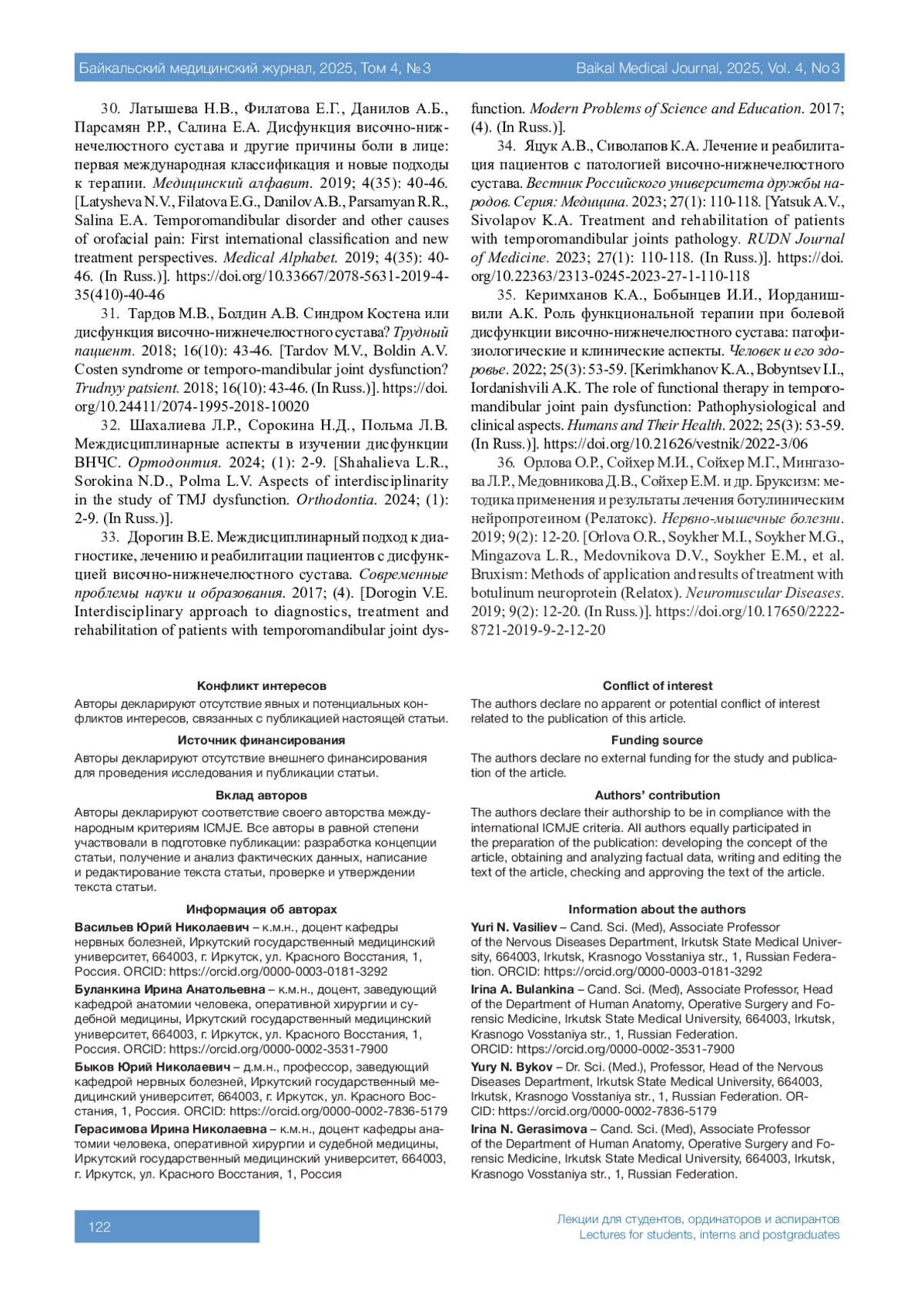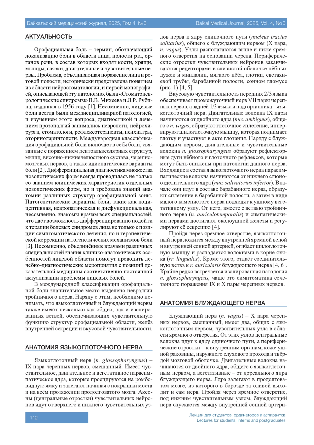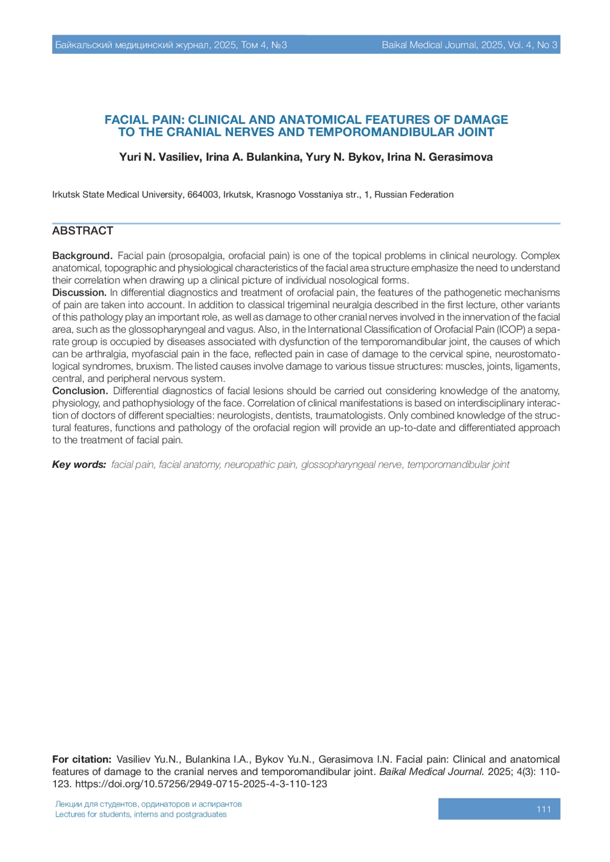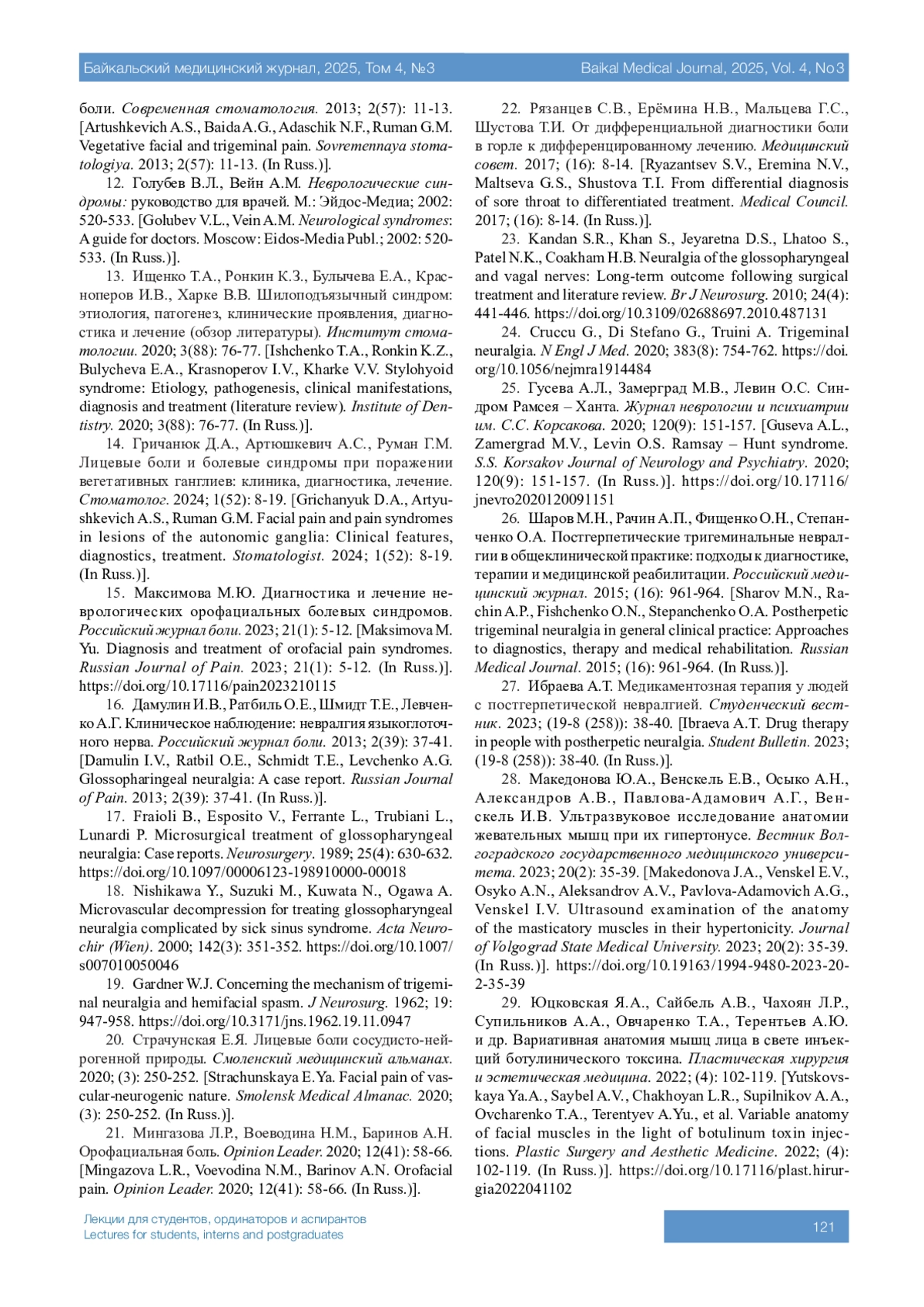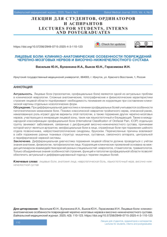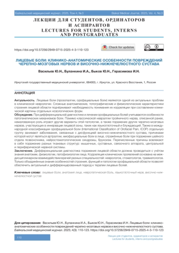 ВАСИЛЬЕВ Ю. Н., БУЛАНКИНА И. А., БЫКОВ Ю. Н., ГЕРАСИМОВА И. Н. ЛИЦЕВЫЕ БОЛИ: КЛИНИКО-АНАТОМИЧЕСКИЕ ОСОБЕННОСТИ ПОВРЕЖДЕНИЙ ЧЕРЕПНО-МОЗГОВЫХ НЕРВОВ И ВИСОЧНО-НИЖНЕЧЕЛЮСТНОГО СУСТАВА // БАЙКАЛЬСКИЙ МЕДИЦИНСКИЙ ЖУРНАЛ. 2025. № 3, ТОМ 4