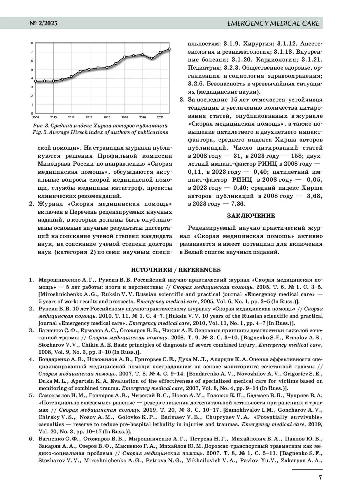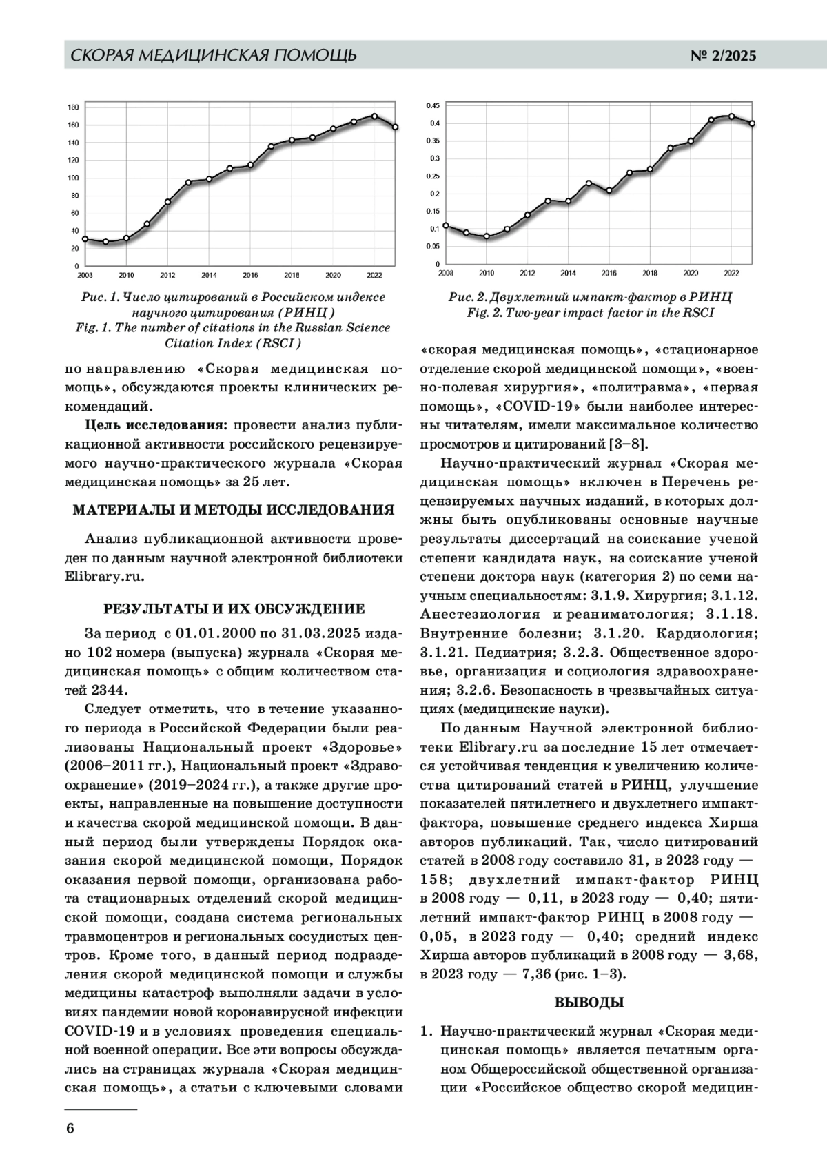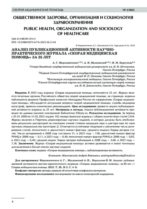 В 2025 году журналу «Скорая медицинская помощь» исполняется 25 лет. Журнал является печатным органом Российского общества скорой медицинской помощи, на страницах журнала публикуются решения Профильной комиссии Минздрава России по направлению «Скорая медицинская помощь», обсуждаются актуальные вопросы скорой медицинской помощи, службы медицины катастроф, проекты клинических рекомендаций. Цель исследования: провести анализ публикационной активности журнала за 25 лет. Материалы и методы. Анализ публикационной активности проведен по данным научной электронной библиотеки Elibrary. ru. Результаты исследования. За период с 01.01.2000 по 31.03.2025 издано 102 номера (выпуска) журнала с общим количеством статей 2344. Журнал включен в Перечень рецензируемых научных изданий, в которых должны быть опубликованы результаты диссертаций на соискание ученой степени кандидата наук и доктора наук по семи научным специальностям (категория 2). Отмечается устойчивая тенденция к увеличению числа цитирования статей, пятилетнего и двухлетнего импакт-фактора, среднего индекса Хирша авторов статей. Число цитирований в 2008 году составило 31, в 2023 году — 158; двухлетний импакт-фактор РИНЦ в 2008 году — 0,11, в 2023 году — 0,40; пятилетний импакт-фактор РИНЦ в 2008 году — 0,05, в 2023 году — 0,40; средний индекс Хирша авторов публикаций в 2008 году — 3,68, в 2023 году — 7,36. Заключение. Журнал «Скорая медицинская помощь» активно развивается и имеет потенциал для включения в Белый список научных изданий.