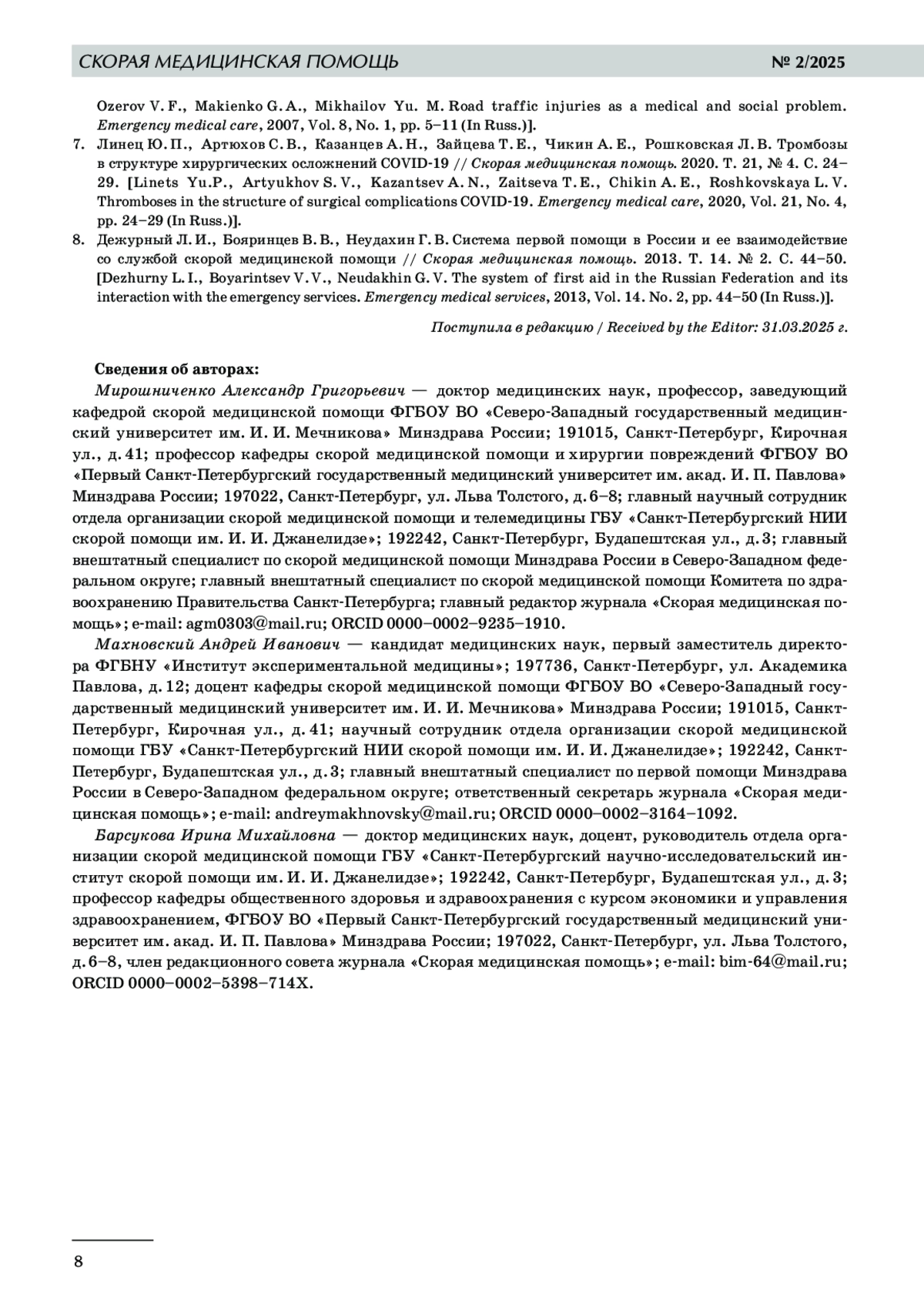 Miroshnichenko A. G., Ruksin V. V.Russian scientific and practical journal “Emergency medical care” - 5 years of work: results and prospects. Emergency medical care, 2005, Vol. 6, No. 1, pp. 3-5 (In Russ.).
