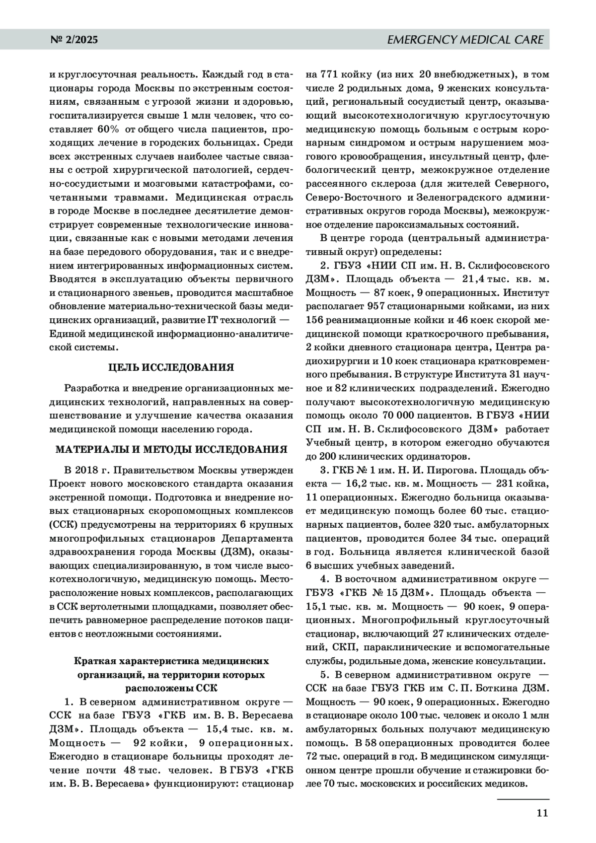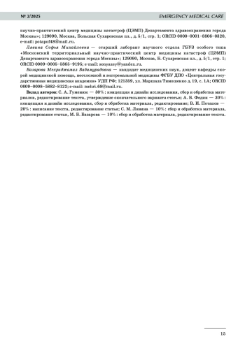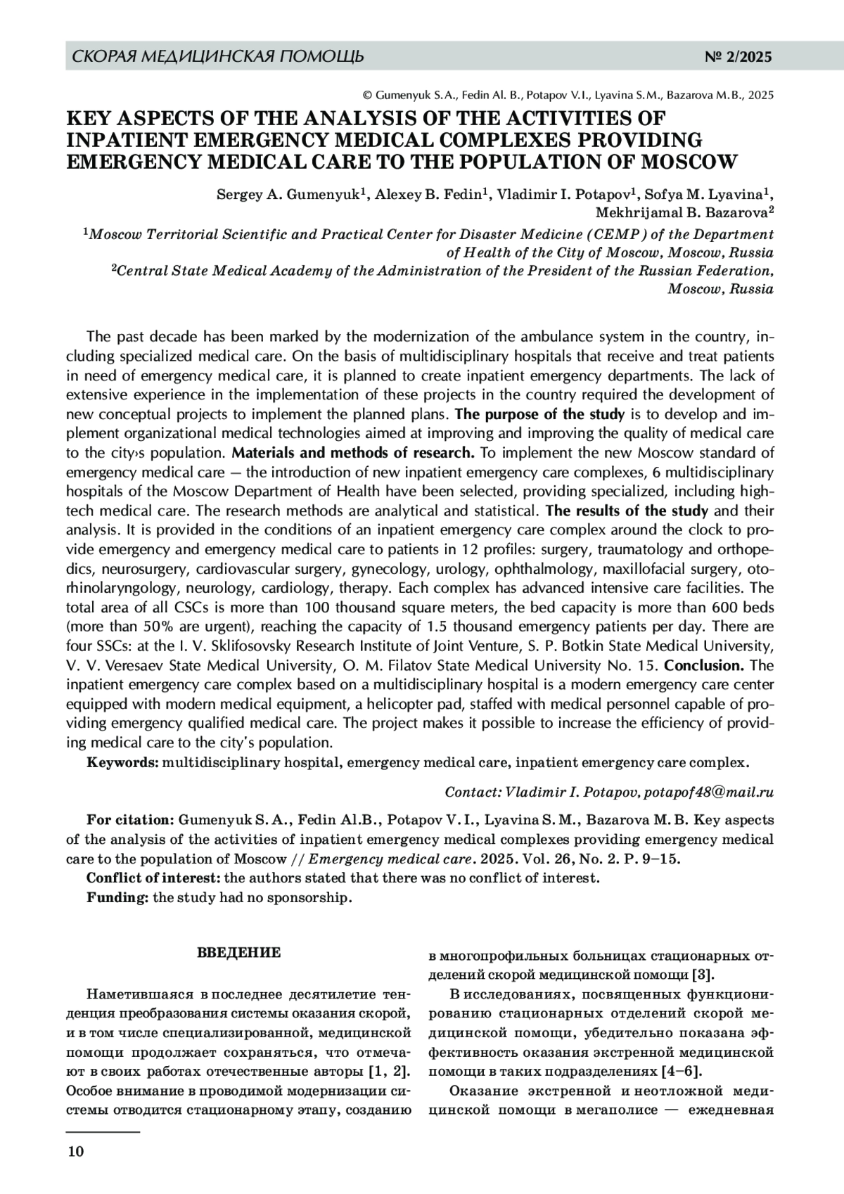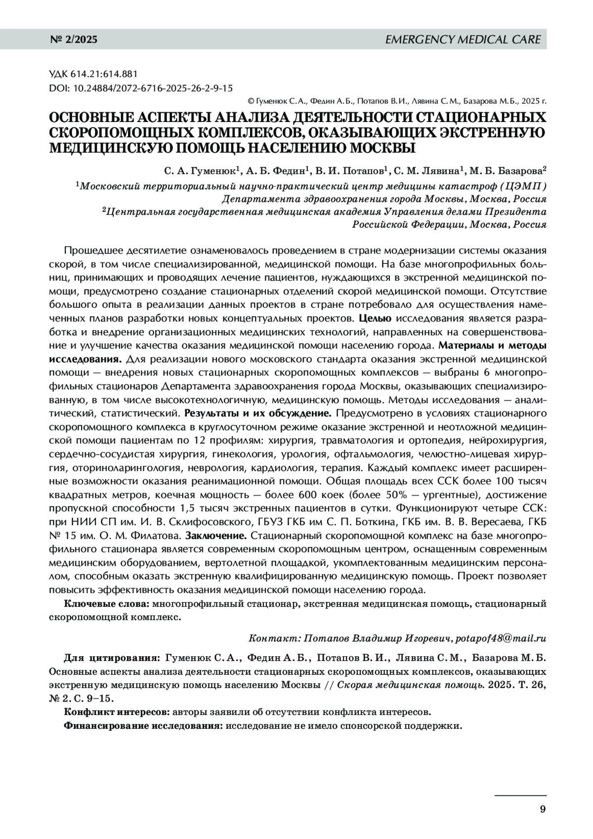 Наметившаяся в последнее десятилетие тенденция преобразования системы оказания скорой, и в том числе специализированной, медицинской помощи продолжает сохраняться, что отмечают в своих работах отечественные авторы [1, 2]. Особое внимание в проводимой модернизации системы отводится стационарному этапу, созданию в многопрофильных больницах стационарных отделений скорой медицинской помощи [3].