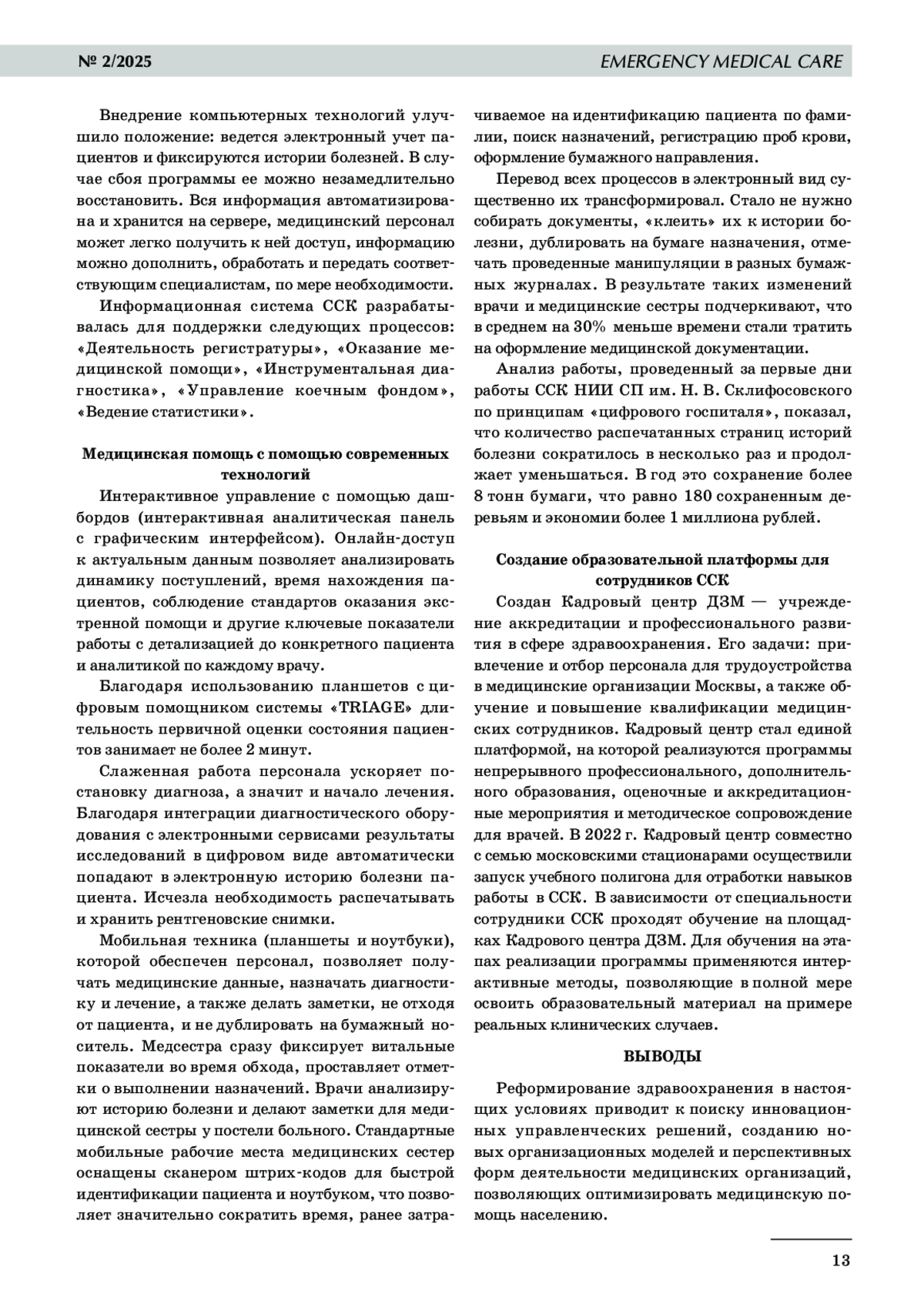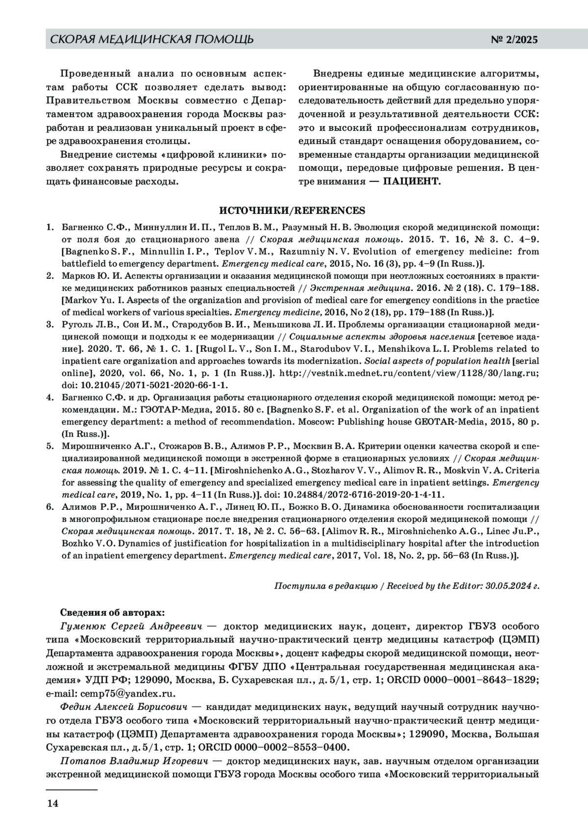1. 	Багненко С.Ф., Миннуллин И. П., Теплов В. М., Разумный Н. В. Эволюция скорой медицинской помощи: от поля боя до стационарного звена // Скорая медицинская помощь. 2015. Т. 16, № 3. С. 4-9.