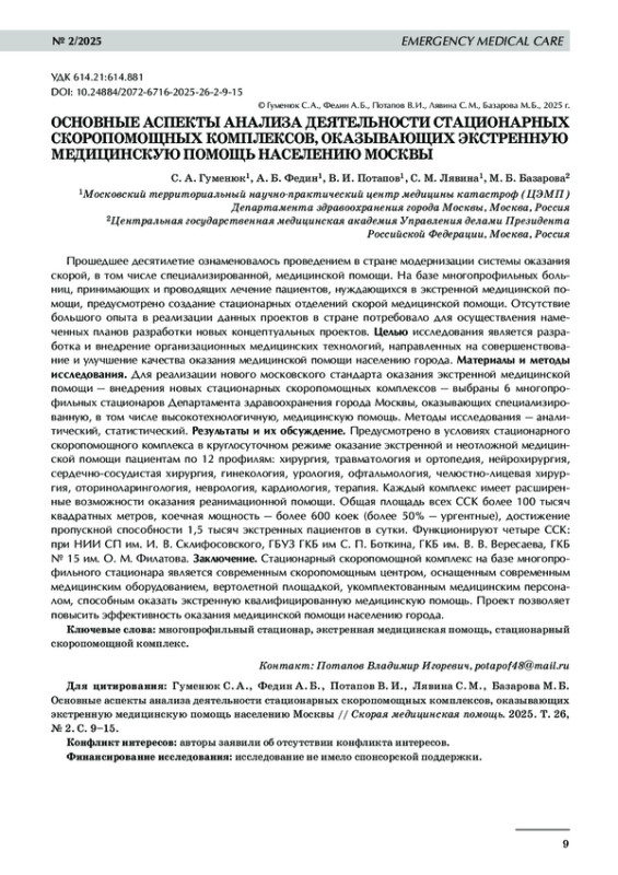 Прошедшее десятилетие ознаменовалось проведением в стране модернизации системы оказания скорой, в том числе специализированной, медицинской помощи. На базе многопрофильных больниц, принимающих и проводящих лечение пациентов, нуждающихся в экстренной медицинской помощи, предусмотрено создание стационарных отделений скорой медицинской помощи. Отсутствие большого опыта в реализации данных проектов в стране потребовало для осуществления намеченных планов разработки новых концептуальных проектов. Целью исследования является разработка и внедрение организационных медицинских технологий, направленных на совершенствование и улучшение качества оказания медицинской помощи населению города. Материалы и методы исследования. Для реализации нового московского стандарта оказания экстренной медицинской помощи — внедрения новых стационарных скоропомощных комплексов — выбраны 6 многопрофильных стационаров Департамента здравоохранения города Москвы, оказывающих специализированную, в том числе высокотехнологичную, медицинскую помощь. Методы исследования — аналитический, статистический. Результаты и их обсуждение. Предусмотрено в условиях стационарного скоропомощного комплекса в круглосуточном режиме оказание экстренной и неотложной медицинской помощи пациентам по 12 профилям: хирургия, травматология и ортопедия, нейрохирургия, сердечно-сосудистая хирургия, гинекология, урология, офтальмология, челюстно-лицевая хирургия, оториноларингология, неврология, кардиология, терапия. Каждый комплекс имеет расширенные возможности оказания реанимационной помощи. Общая площадь всех ССК более 100 тысяч квадратных метров, коечная мощность — более 600 коек (более 50% — ургентные), достижение пропускной способности 1,5 тысяч экстренных пациентов в сутки. Функционируют четыре ССК: при НИИ СП им. И. В. Склифосовского, ГБУЗ ГКБ им С. П. Боткина, ГКБ им. В. В. Вересаева, ГКБ № 15 им. О. М. Филатова. Заключение. Стационарный скоропомощной комплекс на базе многопрофильного стационара является современным скоропомощным центром, оснащенным современным медицинским оборудованием, вертолетной площадкой, укомплектованным медицинским персоналом, способным оказать экстренную квалифицированную медицинскую помощь. Проект позволяет повысить эффективность оказания медицинской помощи населению города.