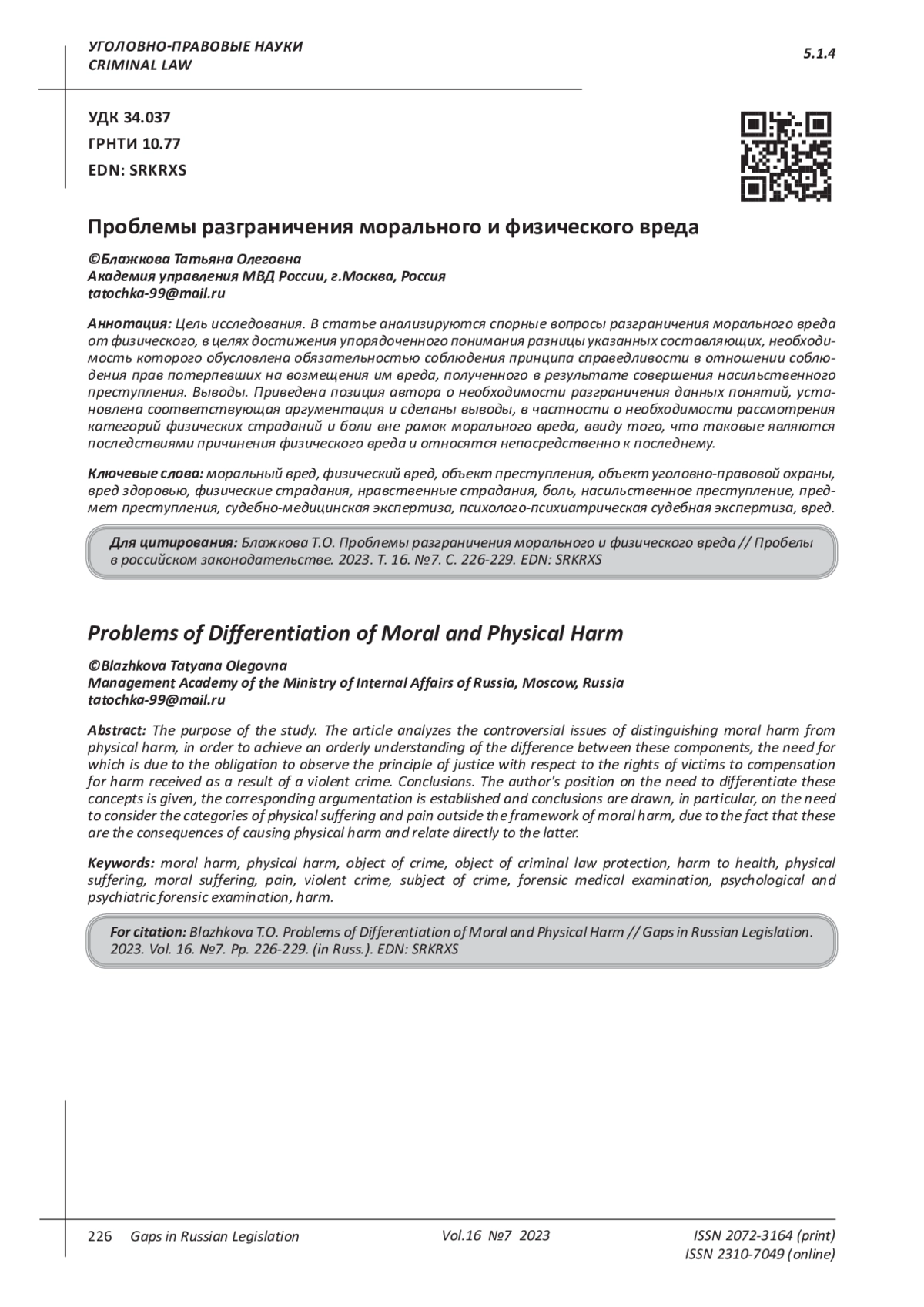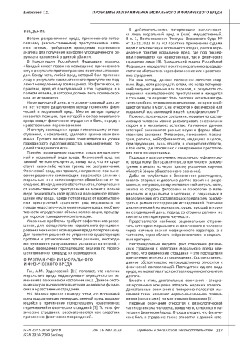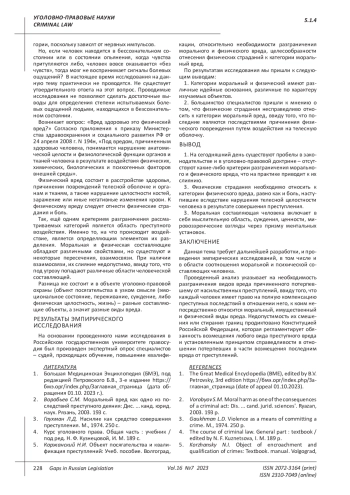 Цель исследования. В статье анализируются спорные вопросы разграничения морального вреда от физического, в целях достижения упорядоченного понимания разницы указанных составляющих, необходимость которого обусловлена обязательностью соблюдения принципа справедливости в отношении соблюдения прав потерпевших на возмещения им вреда, полученного в результате совершения насильственного преступления. Выводы. Приведена позиция автора о необходимости разграничения данных понятий, установлена соответствующая аргументация и сделаны выводы, в частности о необходимости рассмотрения категорий физических страданий и боли вне рамок морального вреда, ввиду того, что таковые являются последствиями причинения физического вреда и относятся непосредственно к последнему.