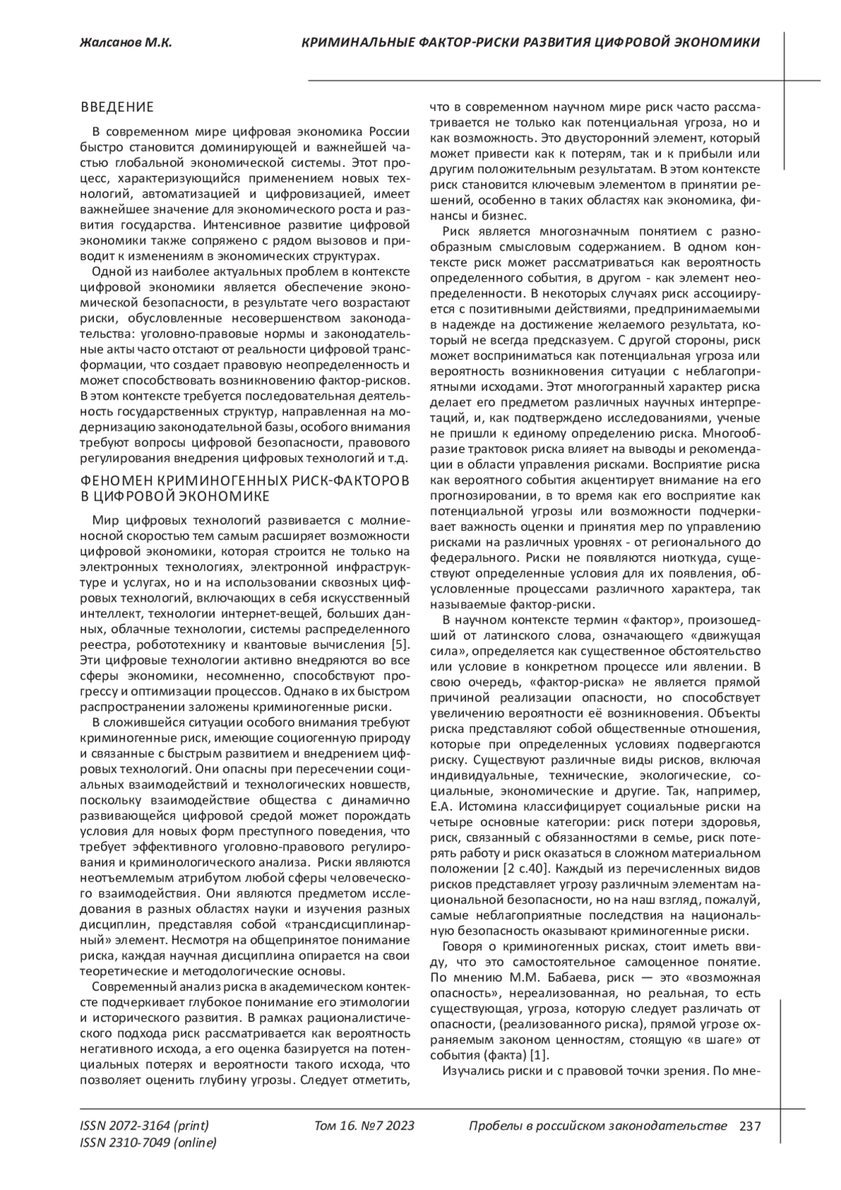ЖАЛСАНОВ М. К. КРИМИНАЛЬНЫЕ ФАКТОР-РИСКИ РАЗВИТИЯ ЦИФРОВОЙ ЭКОНОМИКИ // ПРОБЕЛЫ В РОССИЙСКОМ ЗАКОНОДАТЕЛЬСТВЕ. 2023. Т. 16 № 7 (42 СТ.)
