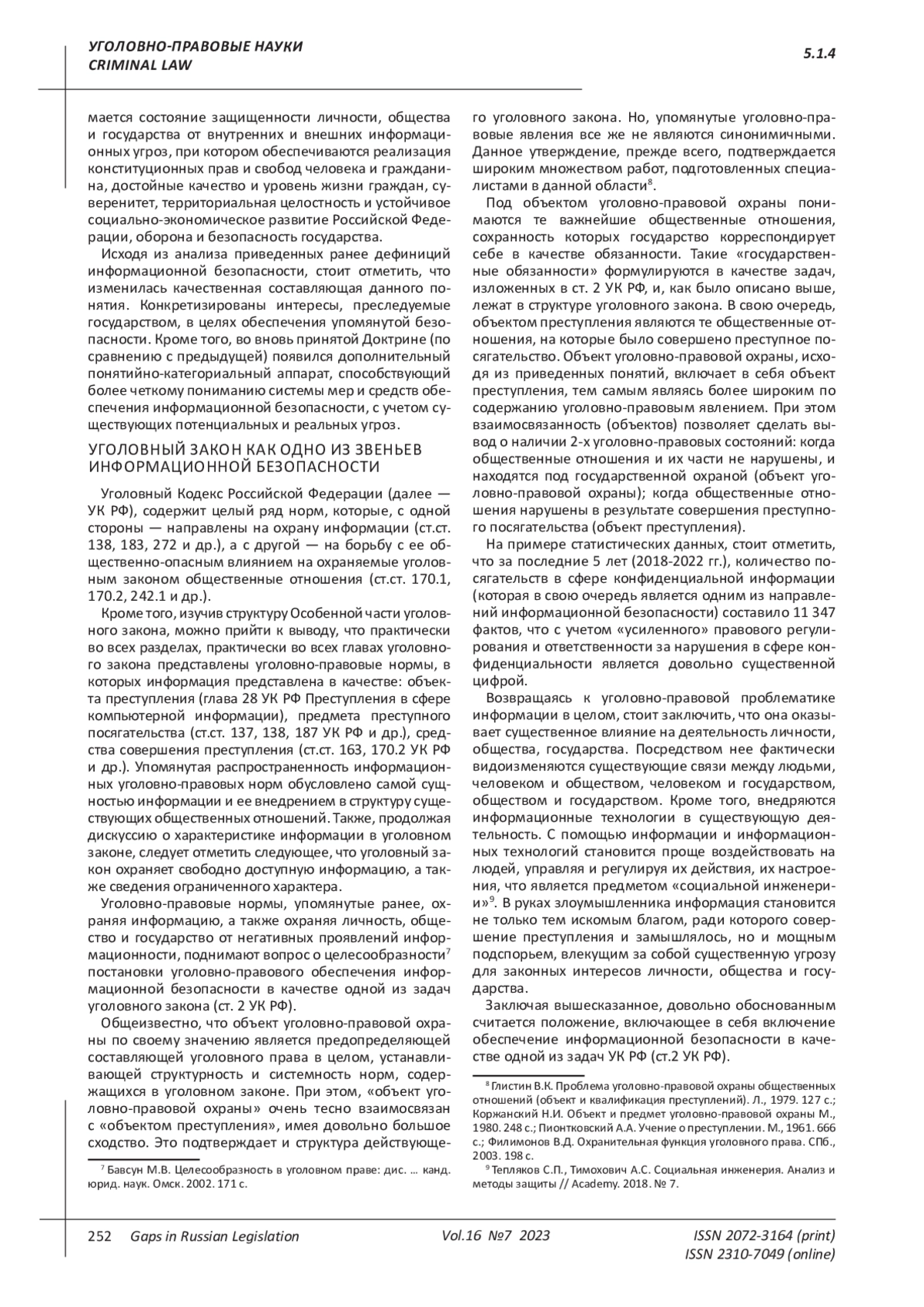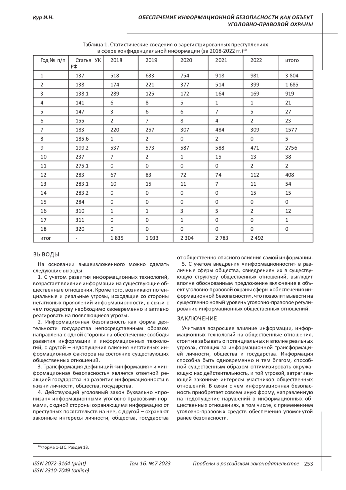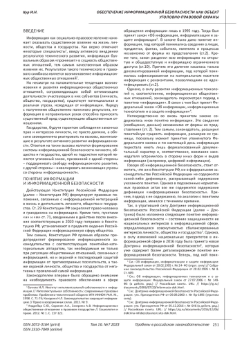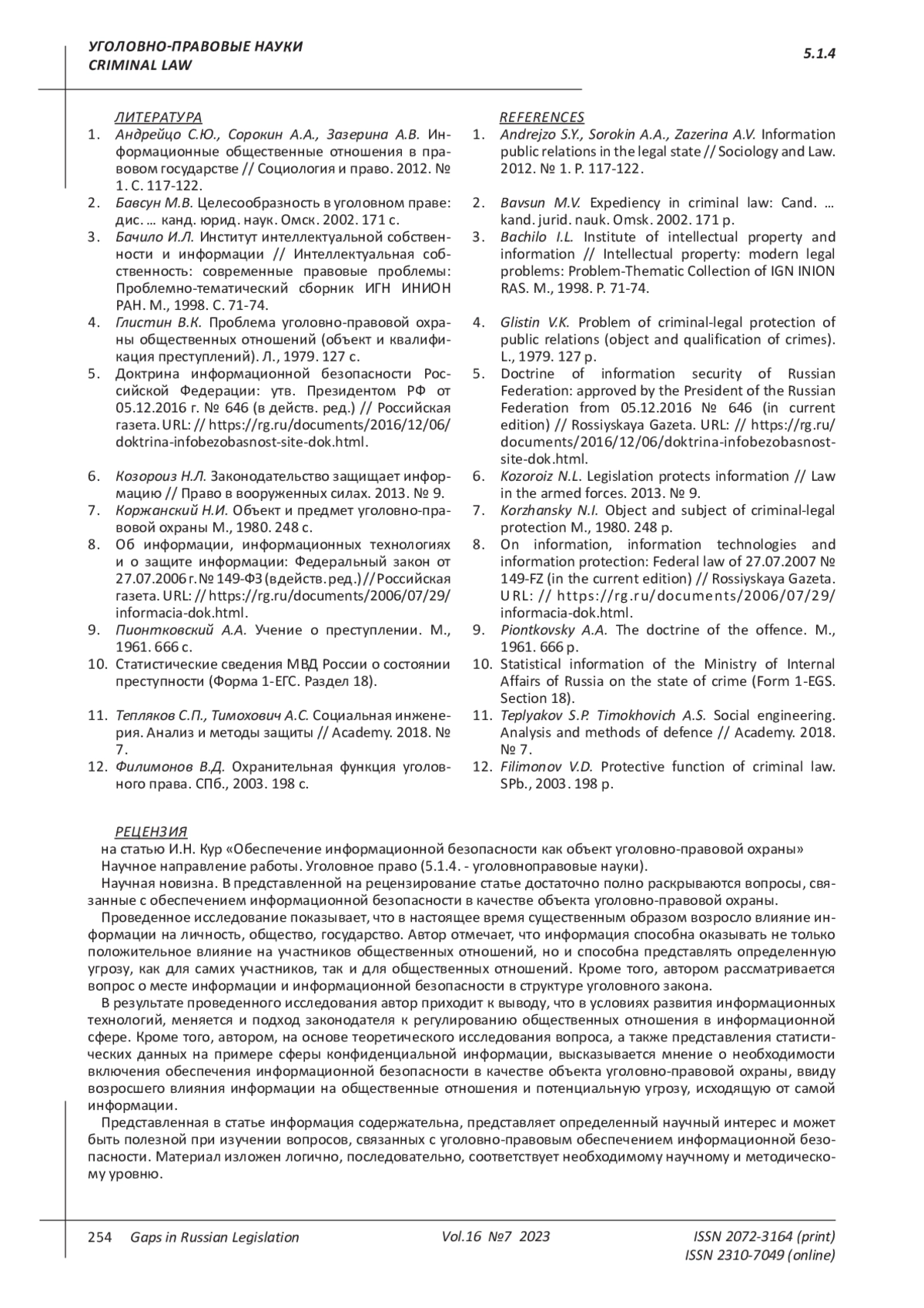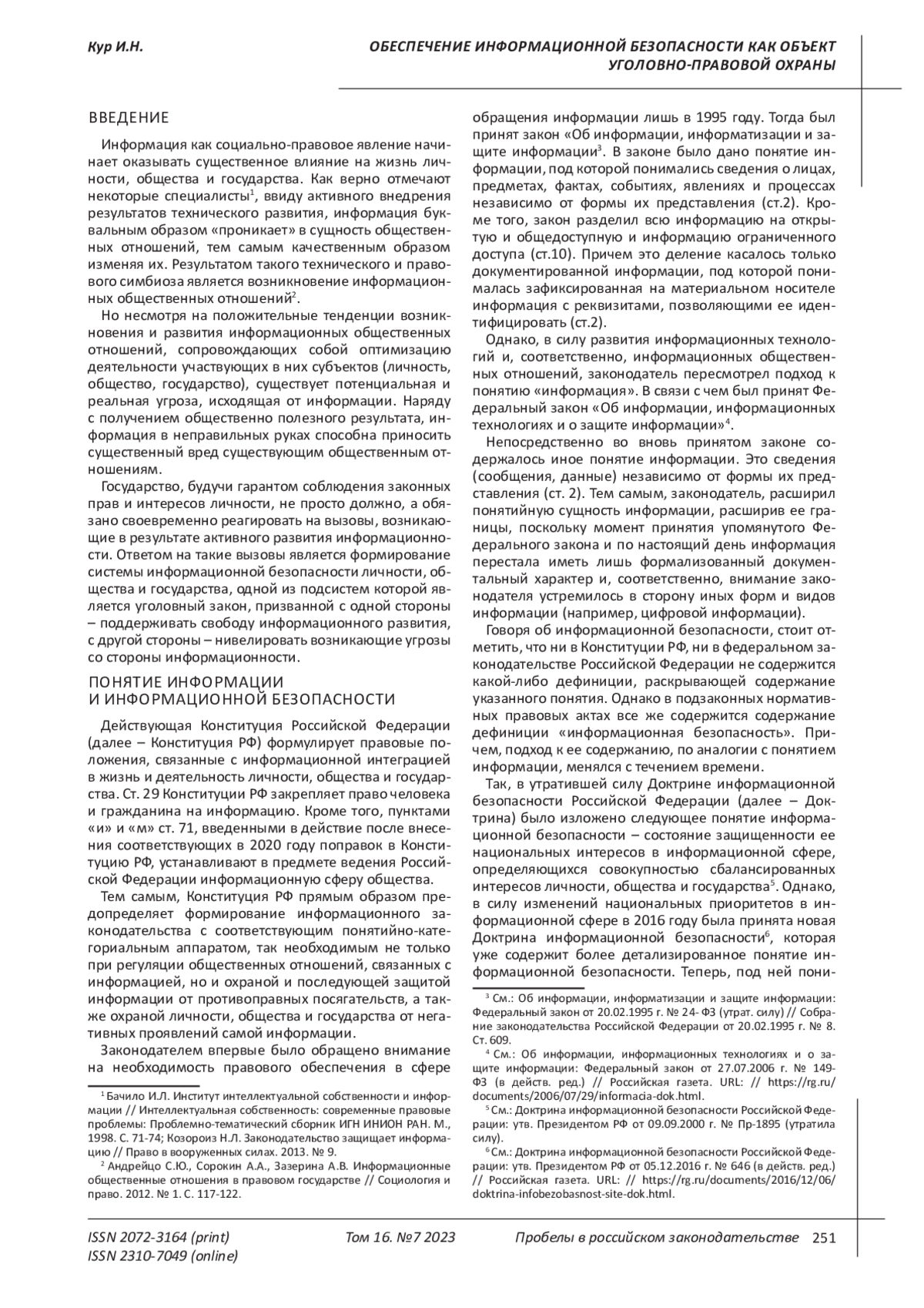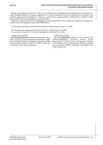 КУР И. Н. ОБЕСПЕЧЕНИЕ ИНФОРМАЦИОННОЙ БЕЗОПАСНОСТИ КАК ОБЪЕКТ УГОЛОВНО-ПРАВОВОЙ ОХРАНЫ // ПРОБЕЛЫ В РОССИЙСКОМ ЗАКОНОДАТЕЛЬСТВЕ. 2023. Т. 16 № 7 (42 СТ.)