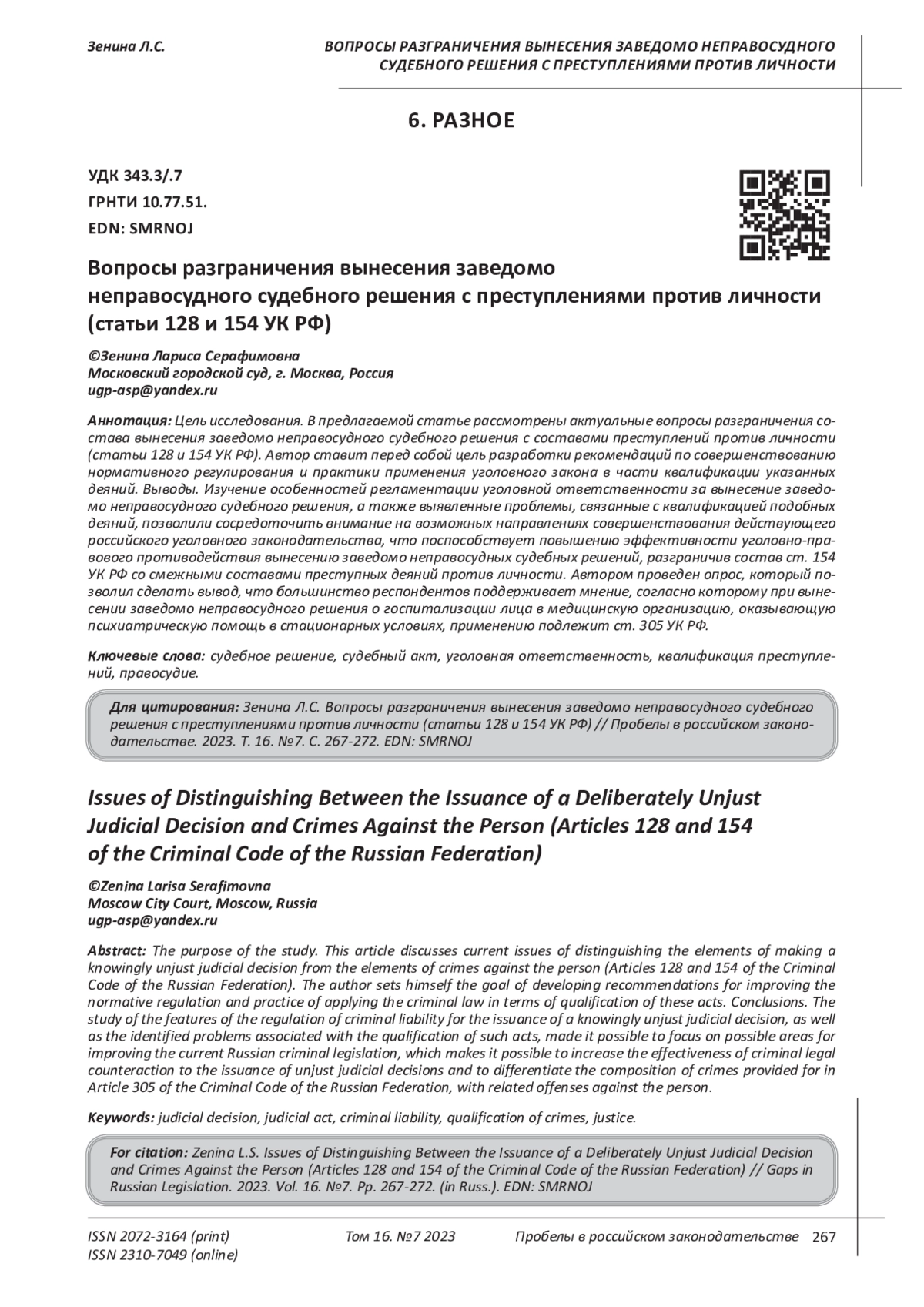 13. Соловьев А.А. Способ совершения вынесения заведомо неправосудных приговора, решения или иного судебного акта// Следственная деятельность: проблемы, их решение, перспективы развития. Материалы V Всеросс. науч.-практ. конф. М., 2022. С. 378-383. EDN: WREFVI