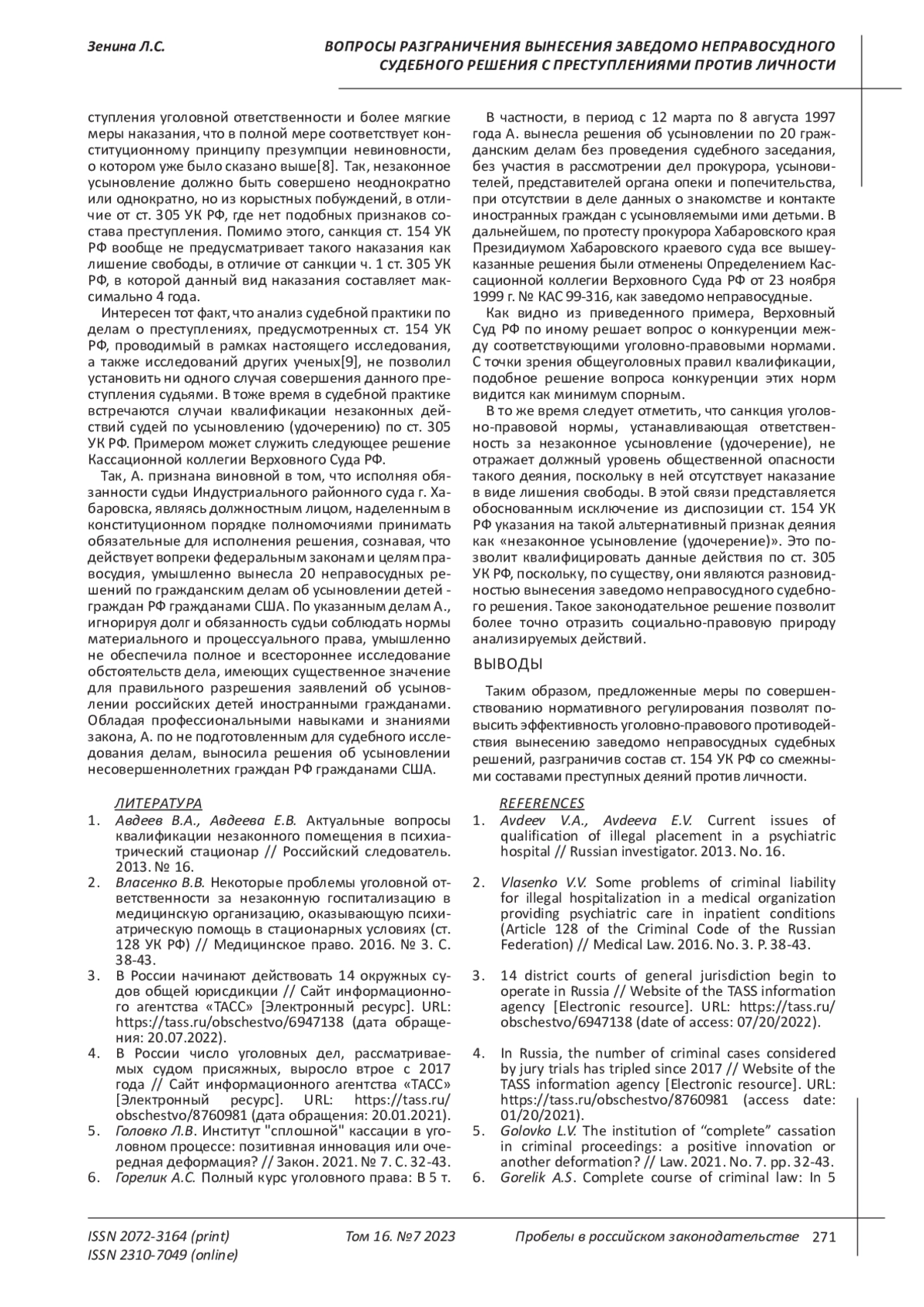 2. Власенко В.В. Некоторые проблемы уголовной ответственности за незаконную госпитализацию в медицинскую организацию, оказывающую психиатрическую помощь в стационарных условиях (ст. 128 УК РФ) // Медицинское право. 2016. № 3. С. 38-43. EDN: WAHQMR