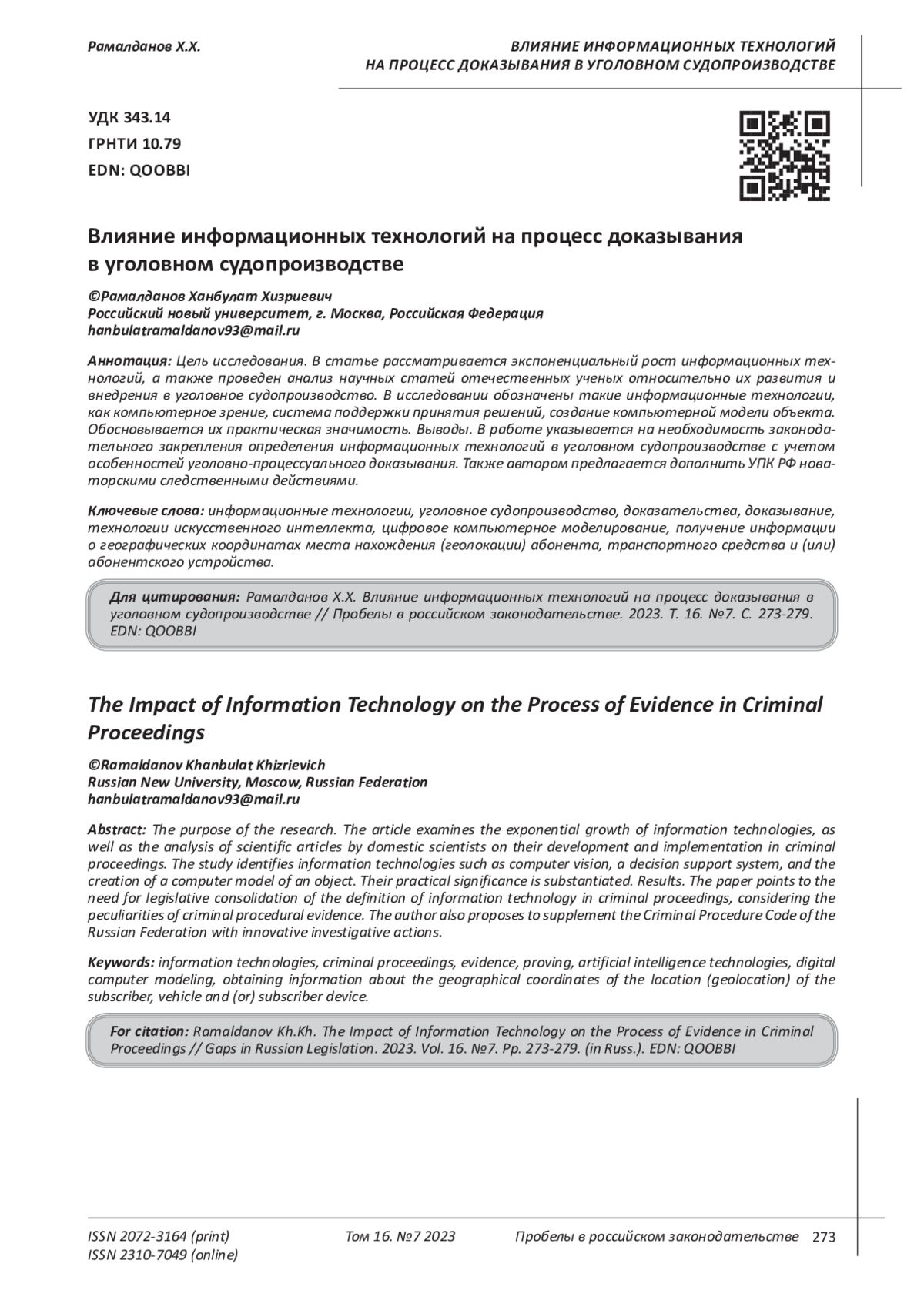 16. Рамалданов Х.Х. Видеопротоколирование как основа цифровизации уголовного судопроизводства // Юристъ-Правоведъ. - 2022. - № 4 (103). - С. 86-92. EDN: WNEIOM