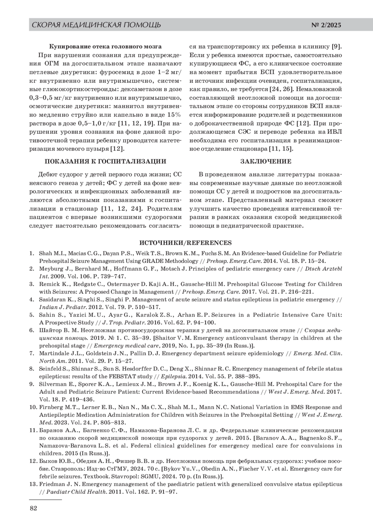 4. 	Sasidaran K., Singhi S., Singhi P. Management of acute seizure and status epilepticus in pediatric emergency // Indian J. Pediatr. 2012. Vol. 79. P. 510-517.