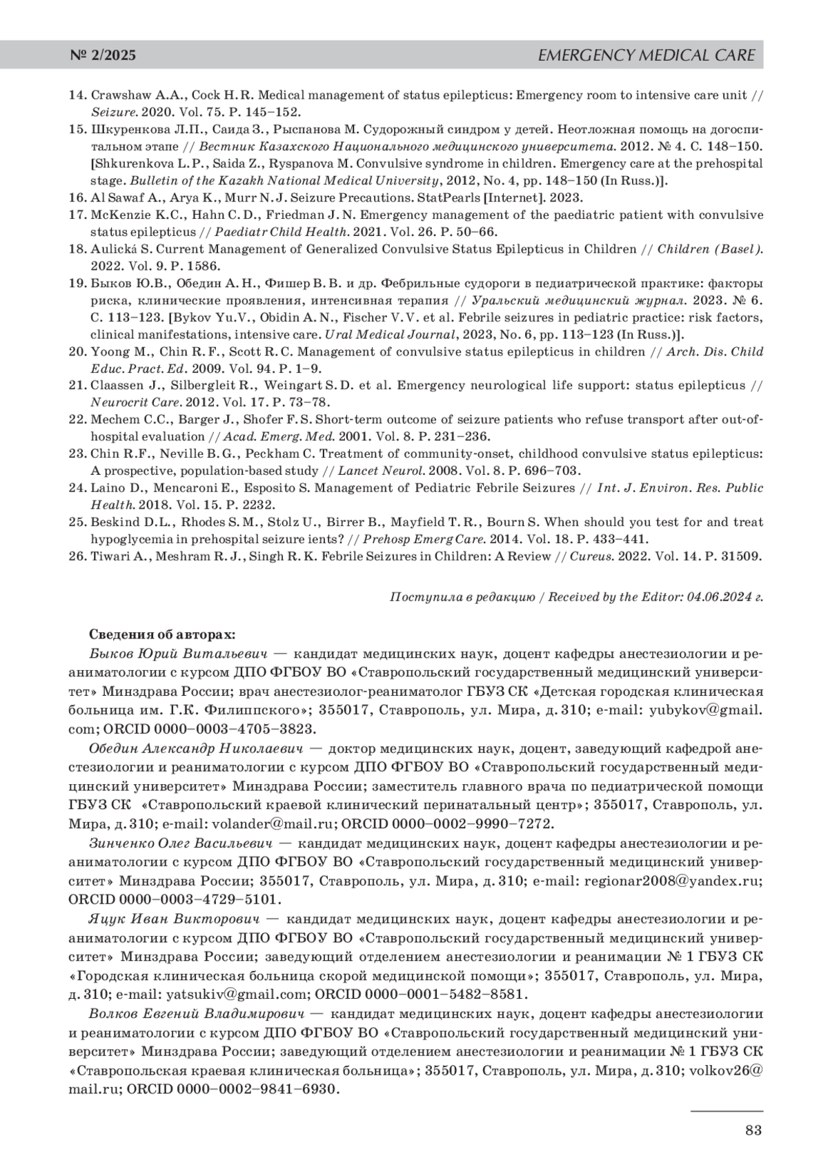 19. 	Быков Ю.В., Обедин А. Н., Фишер В. В. и др. Фебрильные судороги в педиатрической практике: факторы риска, клинические проявления, интенсивная терапия // Уральский медицинский журнал. 2023. № 6. С. 113-123.