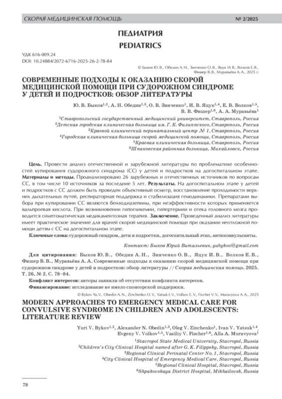 6. 	Шайтор В. М. Неотложная противосудорожная терапия у детей на догоспитальном этапе // Скорая медицинская помощь. 2019. № 1. С. 35-39.