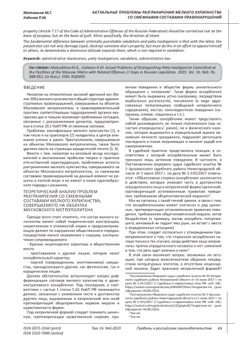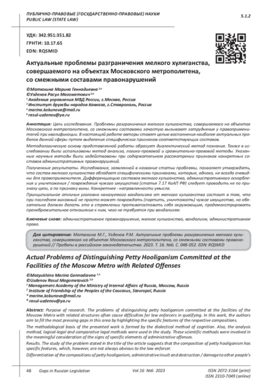 Цель исследования. Проблемы разграничения мелкого хулиганства, совершаемого на объектах Московского метрополитена, со смежными составами зачастую вызывают затруднения у правоприменителей при квалификации. В настоящей работе авторы ставят целью восполнения наиболее актуальных пробелов данной сферы путем выделения специфических признаков соответствующих составов. Методологическую основу представленной работы образует диалектический метод познания. Также в исследовании были использованы метод анализа, логико-правовой и сравнительно-правовой методы. Указанные научные методы были задействованы при содержательном рассмотрении признаков конкретных составов административных правонарушений. Полученные результаты. Исследование, заявленной в название статьи проблемы, позволяет утверждать, что состав мелкого хулиганства обладает специфическими признаками, которые, однако, не всегда очевидны для правоприменителя. Дифференциацию составов мелкого хулиганства, административного оскорбления и уничтожения / повреждения чужого имущества (статья 7.17 КоАП РФ) следует проводить не по признаку цели, а по признаку вины. Конкретнее - направленности умысла. Принципиальное отличие уголовно наказуемого вандализма от мелкого хулиганства состоит в том, что при последнем виновный не просто может повреждать (портить, уничтожать) чужое имущество, но обязательно должен делать это в стремлении противопоставить себя окружающим, продемонстрировать пренебрежительное отношение к ним, чего не требуется при вандализме.