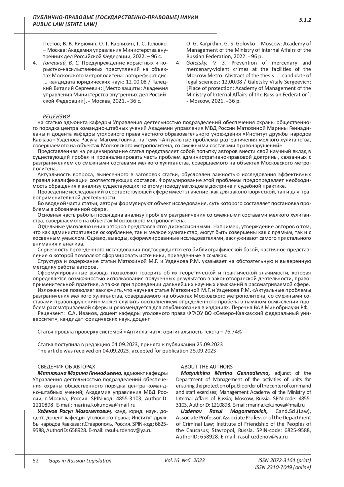 1. Смоляков, А. И. Проблемные вопросы квалификации мелкого хулиганства / А. И. Смоляков // Научный вестник Орловского юридического института МВД России имени В.В. Лукьянова. - 2018. - № 1(74). - С. 80-83. EDN: YSLHLC