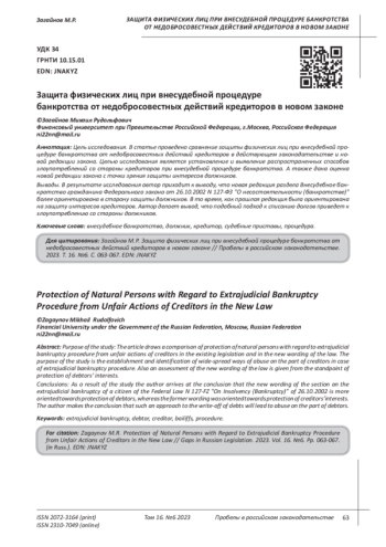 Цель исследования. В статье проведено сравнение защиты физических лиц при внесудебной процедуре банкротства от недобросовестных действий кредиторов в действующем законодательстве и новой редакции закона. Целью исследования является установление и выявление распространенных способов злоупотреблений со стороны кредиторов при внесудебной процедуре банкротства. А также дана оценка новой редакции закона с точки зрения защиты интересов должников. Выводы. В результате исследования автор приходит к выводу, что новая редакция раздела Внесудебное банкротство гражданина Федерального закона от 26.10.2002 N 127-ФЗ “О несостоятельности (банкротстве)” более ориентирована в сторону защиты должников. В то время, как прошлая редакция была ориентирована на защиту интересов кредиторов. Автор делает вывод, что подобный подход к списанию долгов приведет к злоупотреблению со стороны должников.