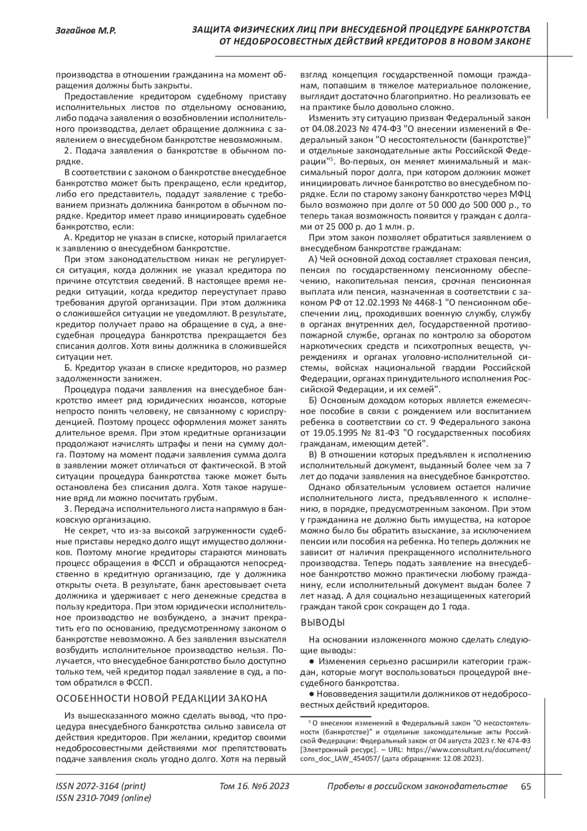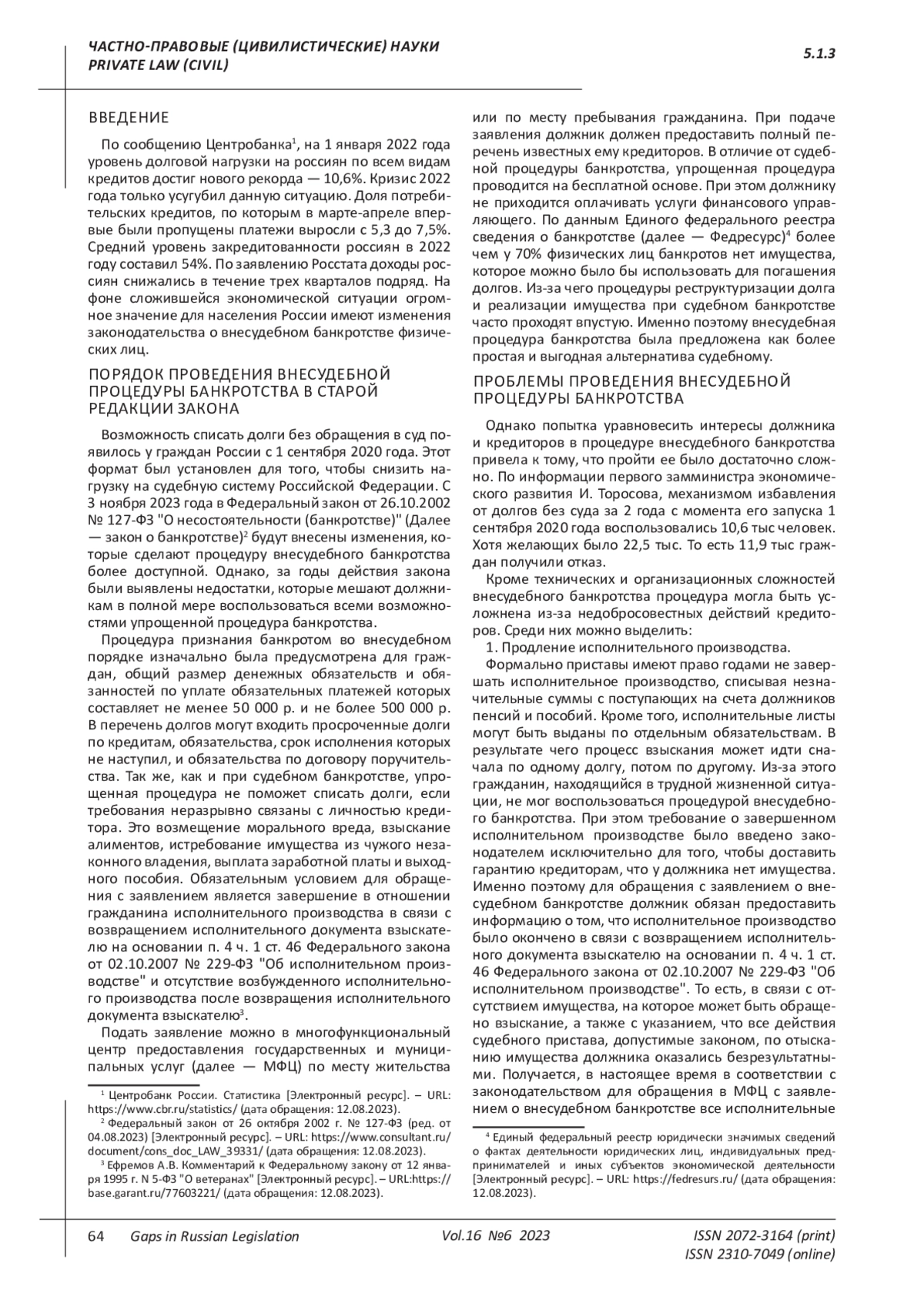 Vavilov M.A., Lagernoy V.V. Current issues of extrajudicial bankruptcy of natural parsons // The Russian judicial system at the current stage of social development. 2022. [Electronic resource]. - URL: https://www.elibrary.ru/item.asp?id=50016957 (access date: 08/12/2023).