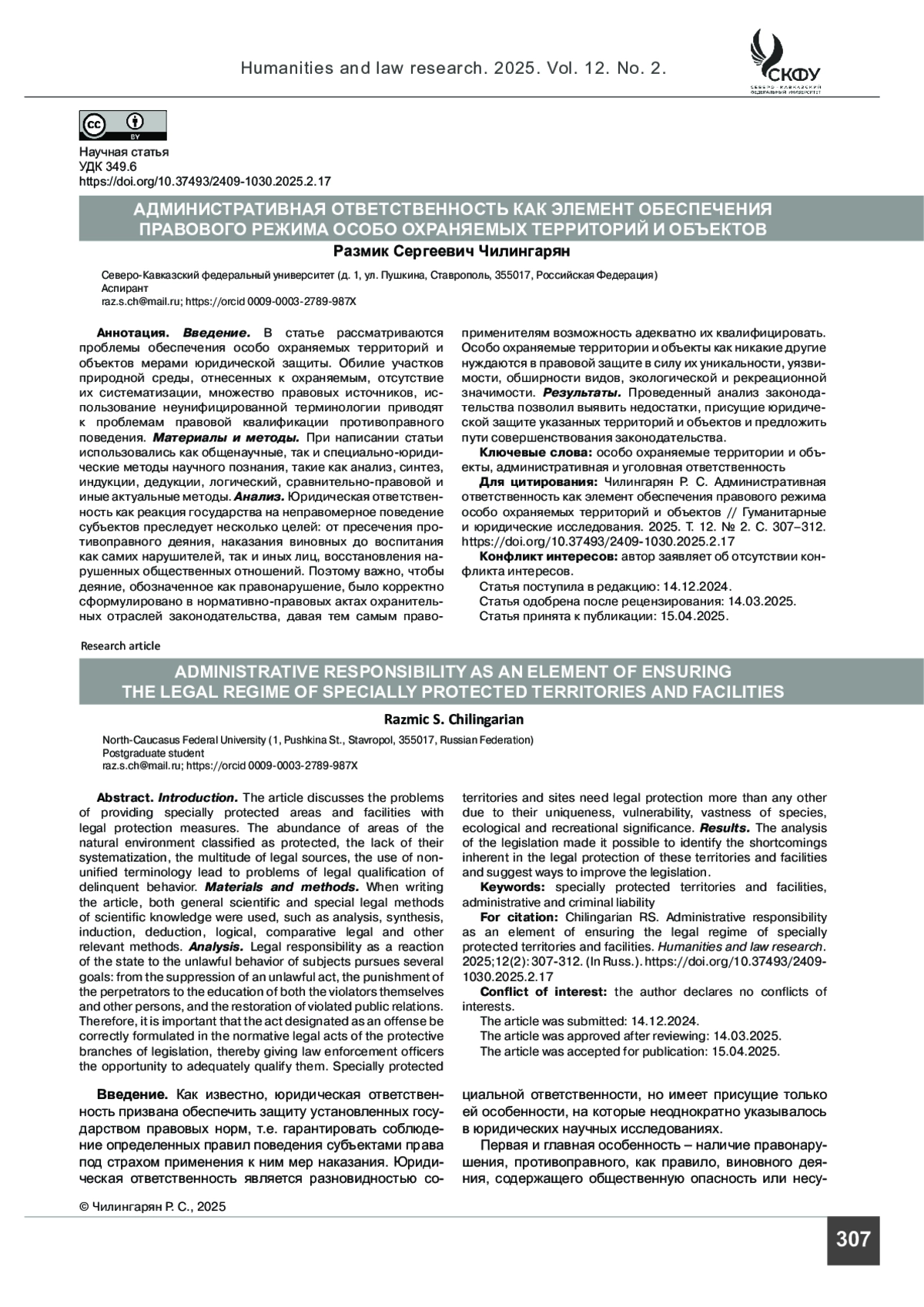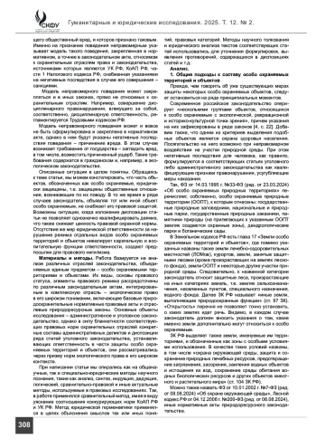 ЧИЛИНГАРЯН Р. С. АДМИНИСТРАТИВНАЯ ОТВЕТСТВЕННОСТЬ КАК ЭЛЕМЕНТ ОБЕСПЕЧЕНИЯ ПРАВОВОГО РЕЖИМА ОСОБО ОХРАНЯЕМЫХ ТЕРРИТОРИЙ И ОБЪЕКТОВ // ГУМАНИТАРНЫЕ И ЮРИДИЧЕСКИЕ ИССЛЕДОВАНИЯ. 2025. ТОМ 12, № 2