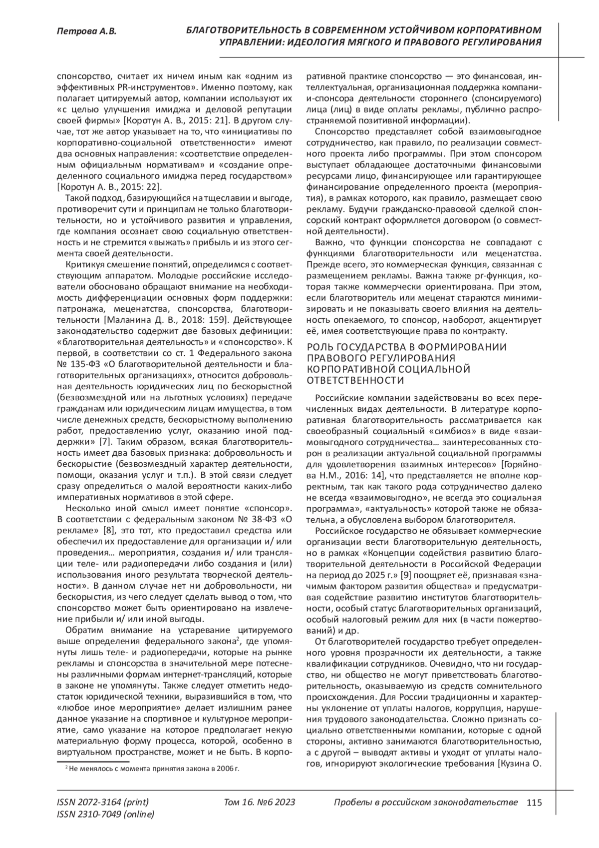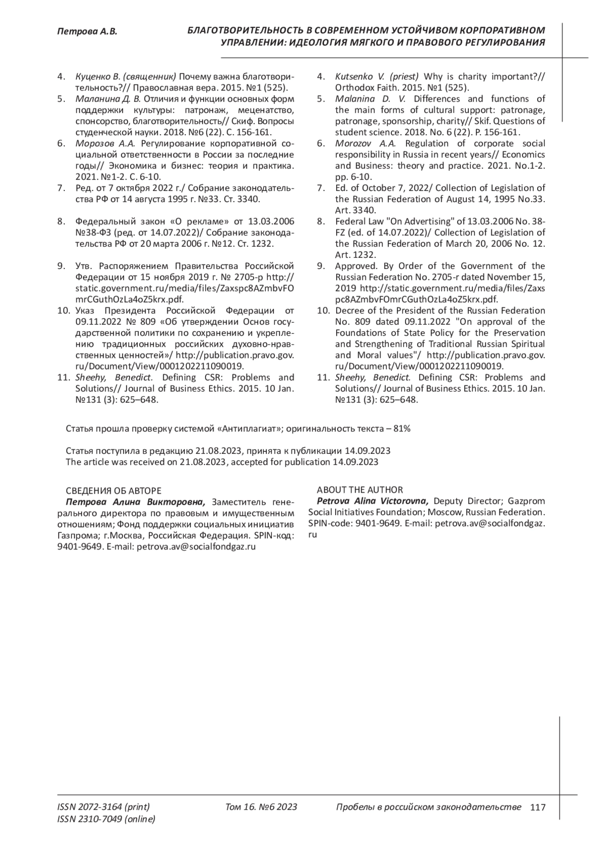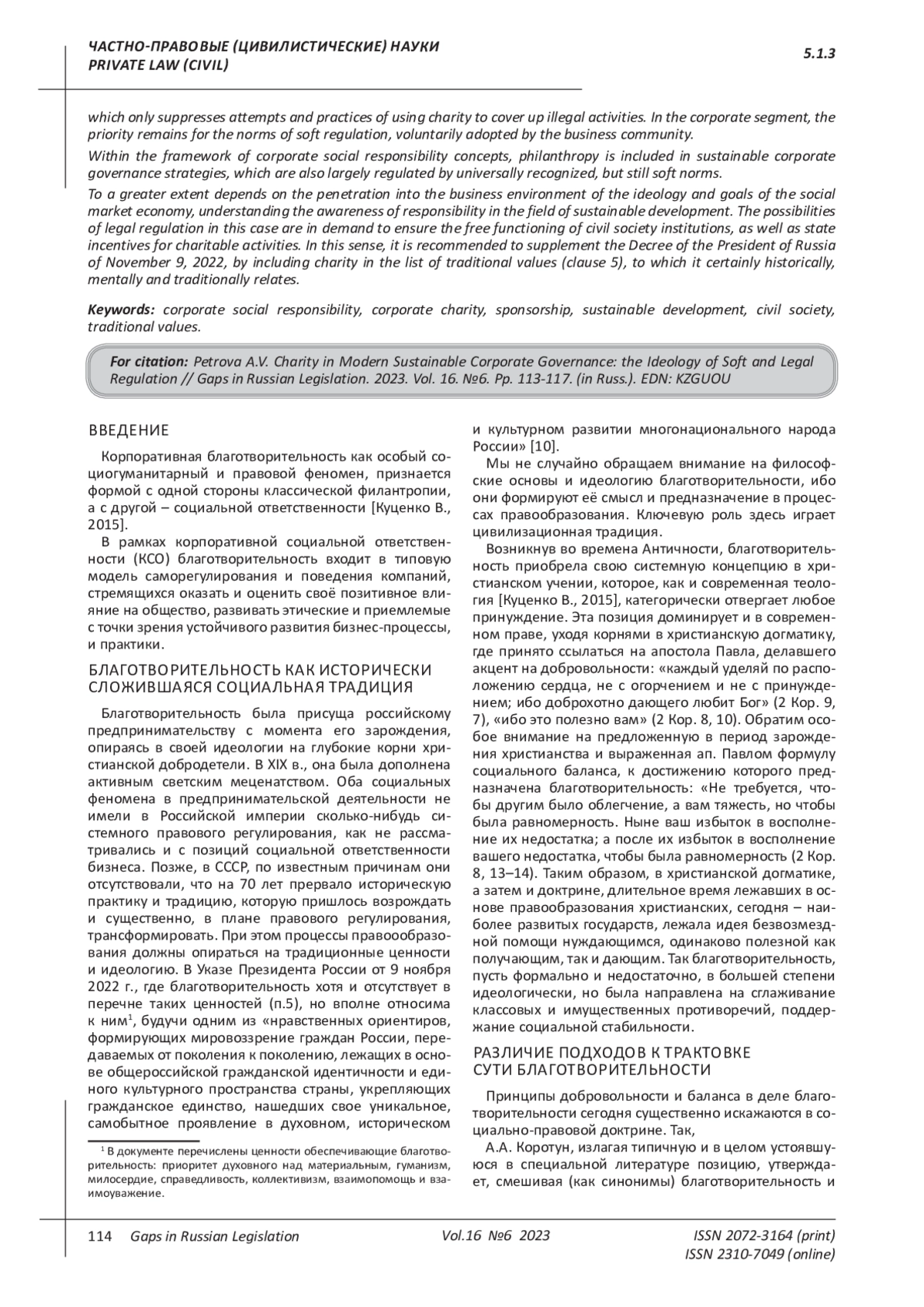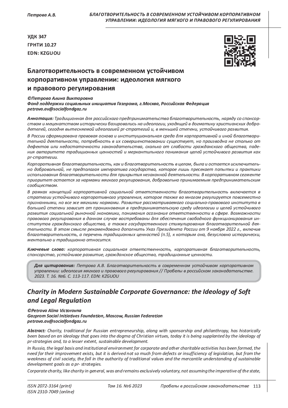 ПЕТРОВА А. В. БЛАГОТВОРИТЕЛЬНОСТЬ В СОВРЕМЕННОМ УСТОЙЧИВОМ КОРПОРАТИВНОМ УПРАВЛЕНИИ: ИДЕОЛОГИЯ МЯГКОГО И ПРАВОВОГО РЕГУЛИРОВАНИЯ // ПРОБЕЛЫ В РОССИЙСКОМ ЗАКОНОДАТЕЛЬСТВЕ. 2023. Т. 16 № 6