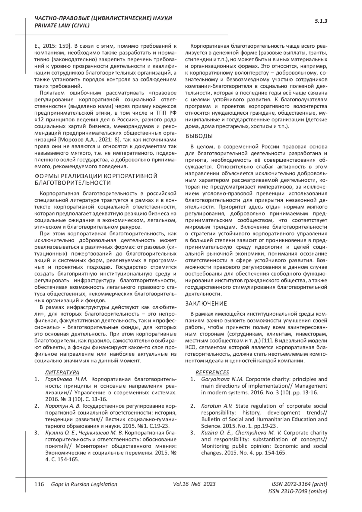 Статья: БЛАГОТВОРИТЕЛЬНОСТЬ В СОВРЕМЕННОМ УСТОЙЧИВОМ КОРПОРАТИВНОМ УПРАВЛЕНИИ: ИДЕОЛОГИЯ МЯГКОГО И ПРАВОВОГО РЕГУЛИРОВАНИЯ (2023)
