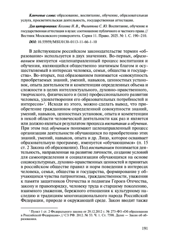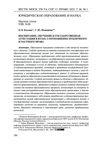 Образование неразрывно соединяет в себе процессы воспитания и обучения. Следует критически оценить возможность квалификации всех образовательных отношений только как отношений по оказанию образовательных услуг. Образование представляет собой трехкомпонентный процесс, включающий обучение, воспитание и государственную итоговую аттестацию. В образовательном процессе можно выделить следующие элементы: 1) частноправовой, состоящий в услуге по обучению, предоставляемой обучающемуся; 2) административно-правовой, состоящий в проведении государственной итоговой аттестации и выдаче документа, подтверждающего наличие у лица образования и квалификации соответствующего уровня; 3) публично-правовой, когда в процессе образования осуществляется воспитание обучающихся, формирование их личности. Следует различать процессы обучения и образования: обучение является частью образовательного процесса и представляет собой гражданское правоотношение, предметом которого является создание обучающимся условий для освоения образовательных программ, возникающее на основании не только лишь распорядительного акта образовательной организации, а также и волеизъявления обучающегося. Образование является сложным, комплексным процессом, включающим в себя помимо гражданских и административных правоотношений между образовательной организацией и обучающимся также и государственный элемент, заключающийся в необходимости воспитания и формирования личности на принципах гуманизма, патриотизма, гражданственности, бережного отношения к окружающей среде, уважения традиционных ценностей.