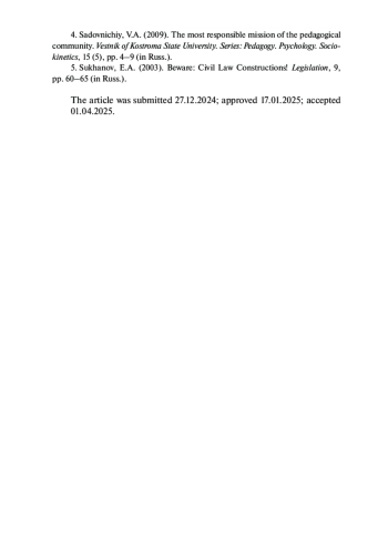 4. Садовничий В. А. Ответственнейшая миссия педагогического сообщества // Вестн. Костромского гос. ун-та имени Н. А. Некрасова. Сер. Педагогика. Психология. Социальная работа. Ювенология. Социокинетика. 2009. Т. 15. № 5. С. 4-9. EDN: ZEFTLP