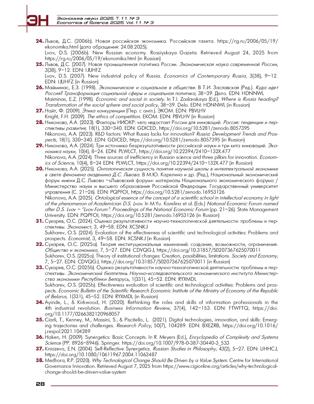 32. Сухарев, О.С. (2025a). Теория институциональных изменений: создание, возможности, ограничения. Общество и экономика, 7, 5-27. EDN: CDVQGJ, https://doi.org/10.31857/S0207367625070011
