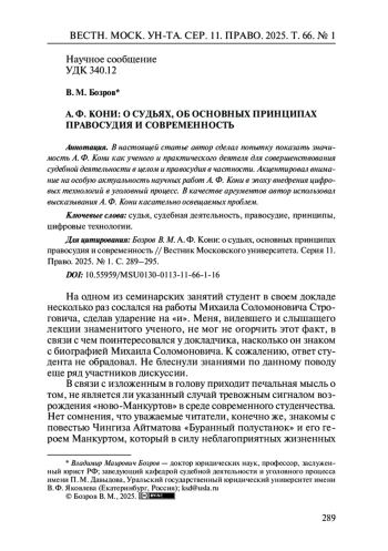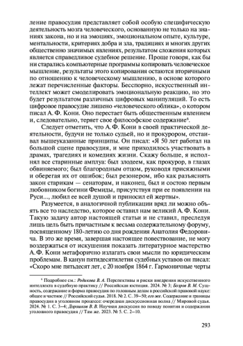 В настоящей статье автор сделал попытку показать значимость А. Ф. Кони как ученого и практического деятеля для совершенствования судебной деятельности в целом и правосудия в частности. Акцентировал внимание на особую актуальность научных работ А. Ф. Кони в эпоху внедрения цифровых технологий в уголовный процесс. В качестве аргументов автор использовал высказывания А. Ф. Кони касательно освещаемых проблем.