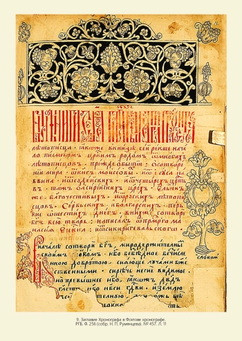 Хронограф Русский — фундаментальный памятник в истории русского самосознания. Среди его заслуг значится утверждение в 1612 г. названия Великая Россия и официальное принятие в 1676 г. концепции единственного во вселенной Российского самодержавного православного царства при венчании Федора Алексеевича, от чина которого и пошли все чины коронации царей с Ивана и Петра (1682) до Николая II (1896). Эти идеи были выражены и с высокой художественной убедительностью обоснованы в трех редакциях Хронографа — богатейшей исторической библиотеки XVI–XVII вв., представившей читателям историю России как важнейшую часть истории всего мира.
