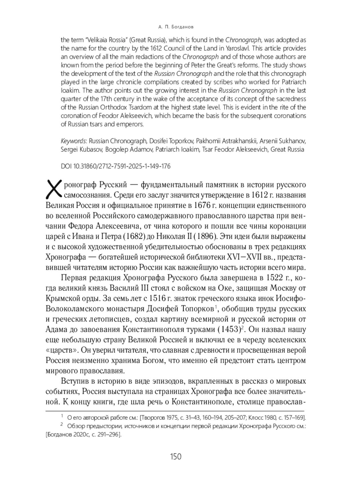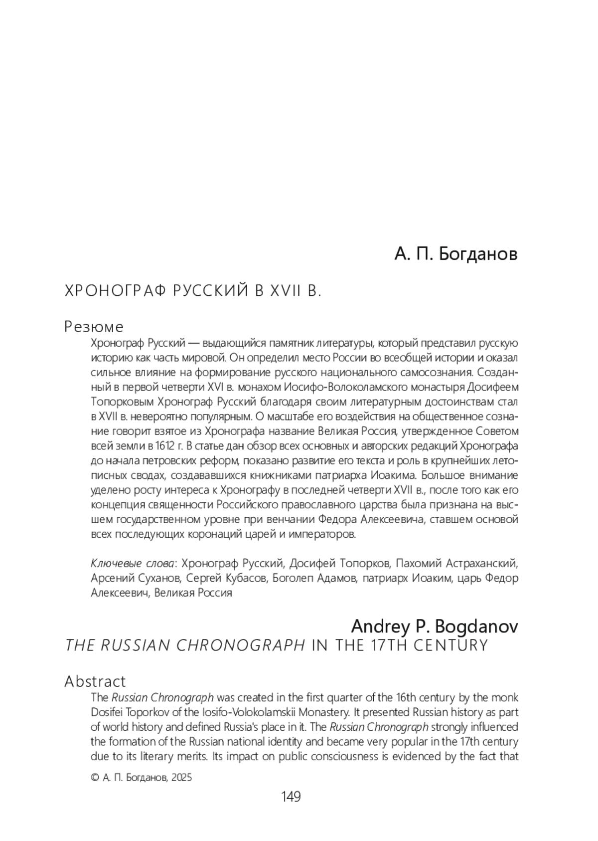 25. 	Богданов А. П. Рукописная традиция Русского Хронографа третьей редакции (продолжение изысканий А. Н. Попова) // Quaestio Rossica. 2023. Т. 11, № 1. С. 291-308.