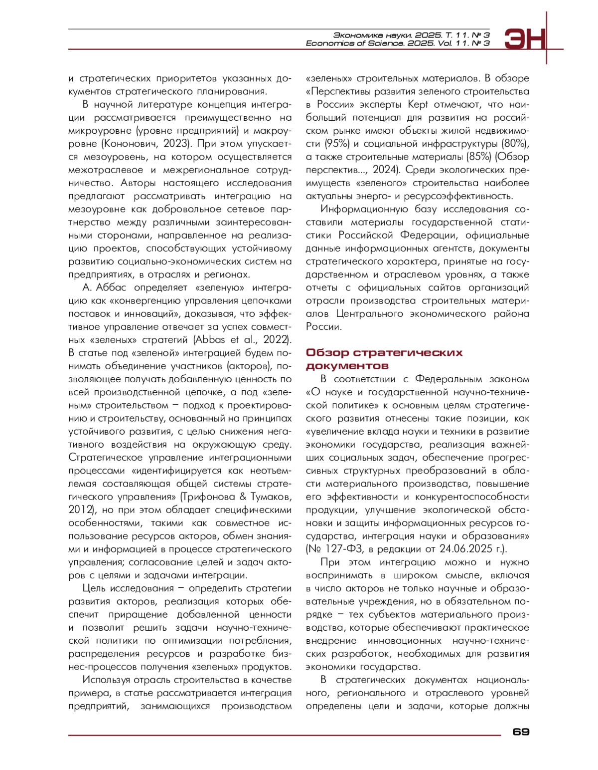 АНДРЕЕВ В. Н., ТОЛСТЫХ Т. О., РУДОМАЗИН В. В. СТРАТЕГИЧЕСКИЕ ПОДХОДЫ К ИНТЕГРАЦИИ В «ЗЕЛЕНОМ» СТРОИТЕЛЬСТВЕ КАК ФАКТОР НАУЧНО-ТЕХНИЧЕСКОЙ ПОЛИТИКИ // ЭКОНОМИКА НАУКИ. 2025. ТОМ 11, № 3