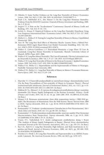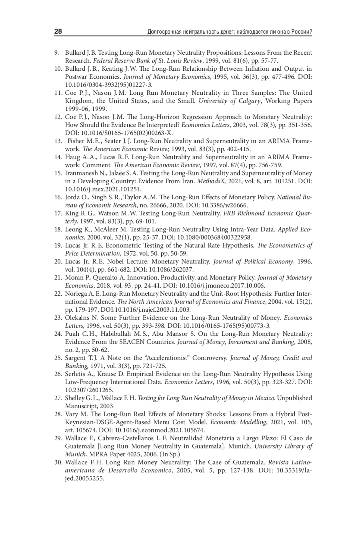 23. Olekalns N. Some Further Evidence on the Long-Run Neutrality of Money //Economics Letters. 1996. Vol. 50(3). P. 393-398. https://doi.org/10.1016/0165-1765(95)00773-3.