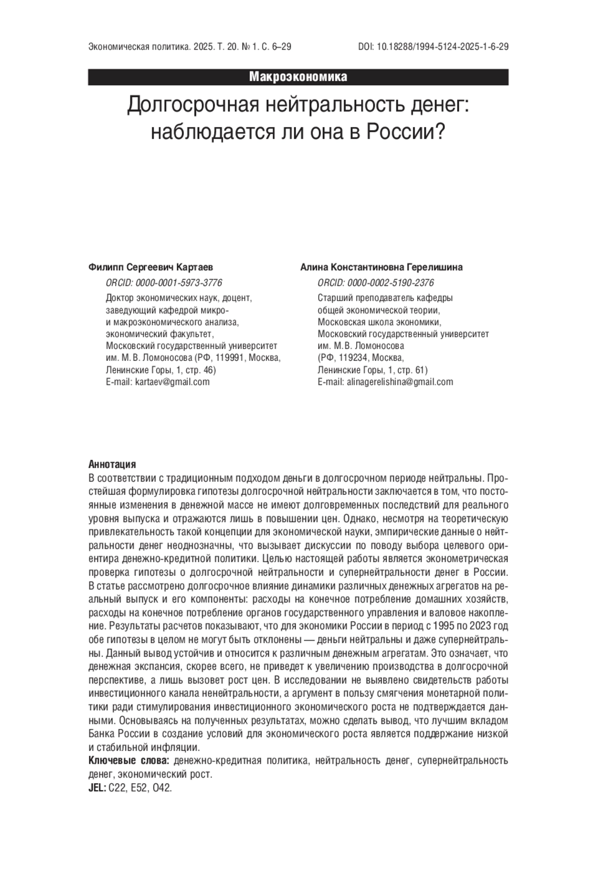 2. Малкина М.Ю., Моисеев И.А. К вопросу об эндогенности предложения денег в российской экономике //Финансы и кредит. 2019. Т. 25. № 10. С. 2266-2280. https://doi.org/10.24891/fc.25.10.2266.