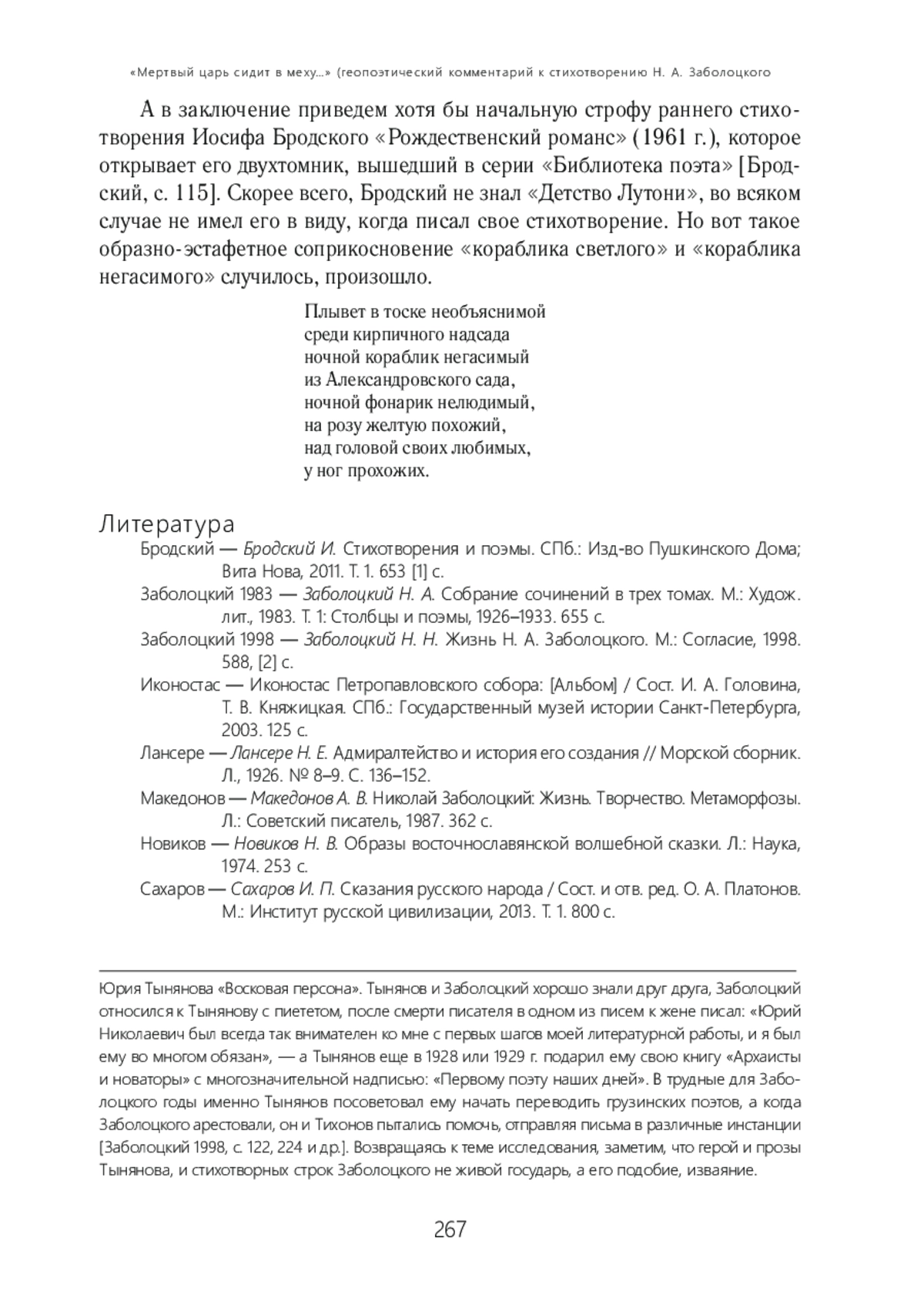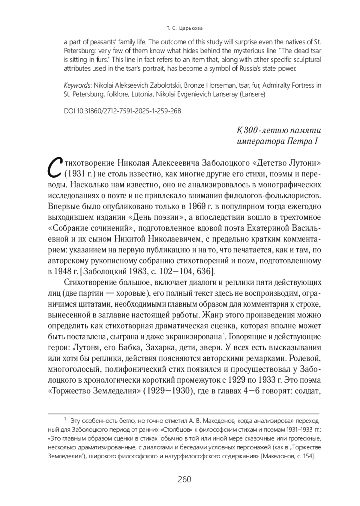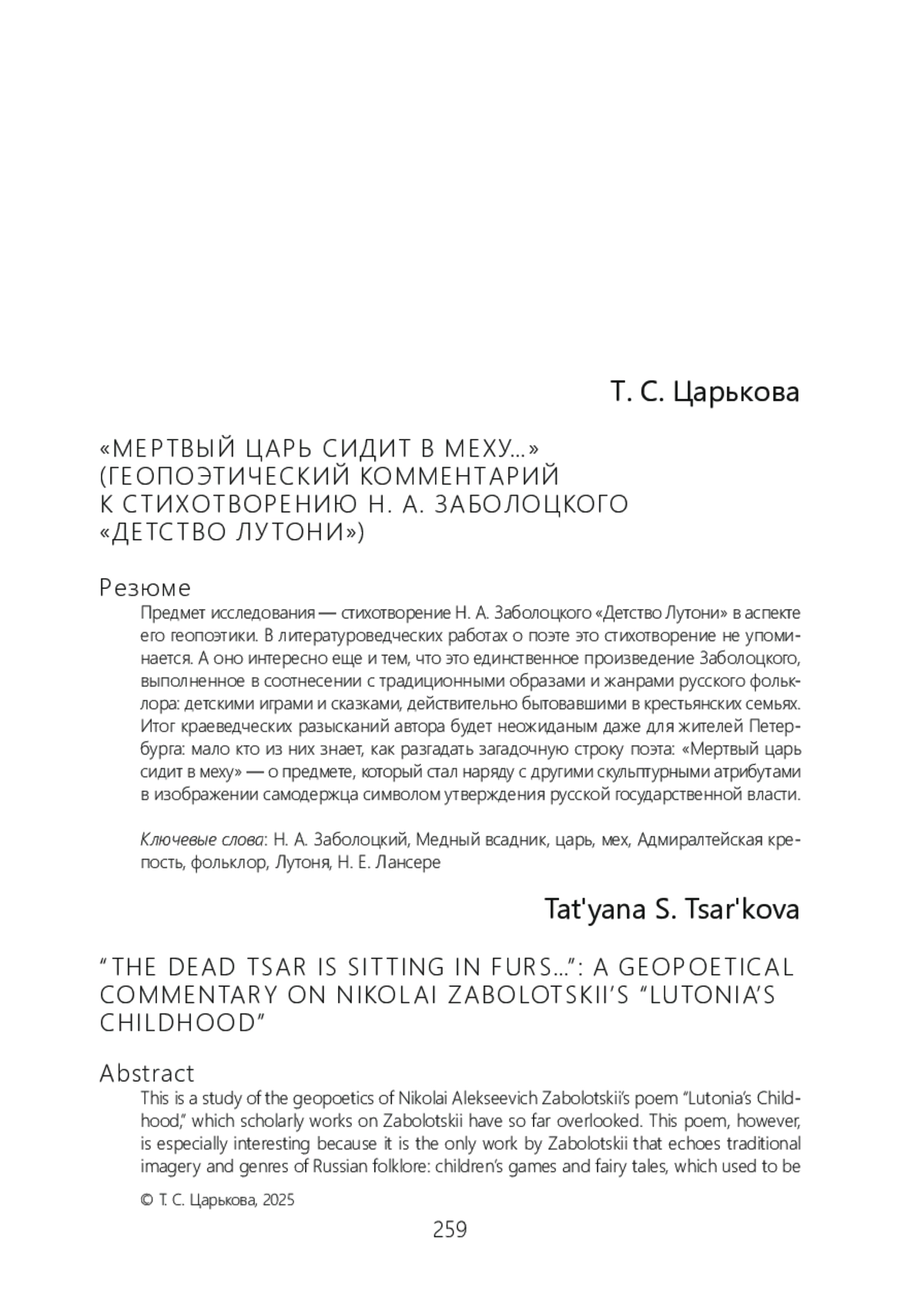 ЦАРЬКОВА Т. С. «МЕРТВЫЙ ЦАРЬ СИДИТ В МЕХУ…» (ГЕОПОЭТИЧЕСКИЙ КОММЕНТАРИЙ К СТИХОТВОРЕНИЮ Н. А. ЗАБОЛОЦКОГО «ДЕТСТВО ЛУТОНИ») // СЛОВЕСНОСТЬ И ИСТОРИЯ. 2025. № 1