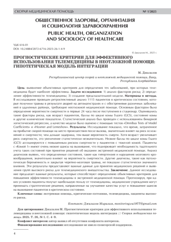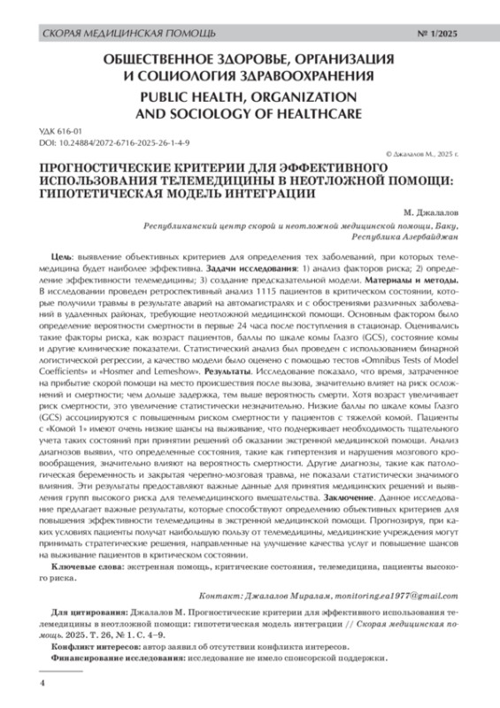 Цель: выявление объективных критериев для определения тех заболеваний, при которых телемедицина будет наиболее эффективна. Задачи исследования: 1) анализ факторов риска; 2) определение эффективности телемедицины; 3) создание предсказательной модели. Материалы и методы. В исследовании проведен ретроспективный анализ 1115 пациентов в критическом состоянии, которые получили травмы в результате аварий на автомагистралях и с обострениями различных заболеваний в удаленных районах, требующие неотложной медицинской помощи. Основным фактором было определение вероятности смертности в первые 24 часа после поступления в стационар. Оценивались такие факторы риска, как возраст пациентов, баллы по шкале комы Глазго (GCS), состояние комы и другие клинические показатели. Статистический анализ был проведен с использованием бинарной логистической регрессии, а качество модели было оценено с помощью тестов «Omnibus Tests of Model Coefficients» и «Hosmer and Lemeshow». Результаты. Исследование показало, что время, затраченное на прибытие скорой помощи на место происшествия после вызова, значительно влияет на риск осложнений и смертности; чем дольше задержка, тем выше вероятность смерти. Хотя возраст увеличивает риск смертности, это увеличение статистически незначительно. Низкие баллы по шкале комы Глазго (GCS) ассоциируются с повышенным риском смертности у пациентов с тяжелой комой. Пациенты с «Комой 1» имеют очень низкие шансы на выживание, что подчеркивает необходимость тщательного учета таких состояний при принятии решений об оказании экстренной медицинской помощи. Анализ диагнозов выявил, что определенные состояния, такие как гипертензия и нарушения мозгового кровообращения, значительно влияют на вероятность смертности. Другие диагнозы, такие как патологическая беременность и закрытая черепно-мозговая травма, не показали статистически значимого влияния. Эти результаты предоставляют важные данные для принятия медицинских решений и выявления групп высокого риска для телемедицинского вмешательства. Заключение. Данное исследование предлагает важные результаты, которые способствуют определению объективных критериев для повышения эффективности телемедицины в экстренной медицинской помощи. Прогнозируя, при каких условиях пациенты получат наибольшую пользу от телемедицины, медицинские учреждения могут принимать стратегические решения, направленные на улучшение качества услуг и повышение шансов на выживание пациентов в критическом состоянии.