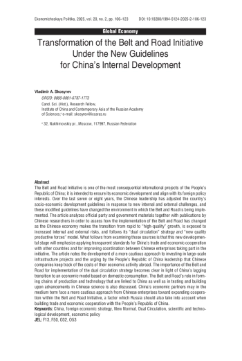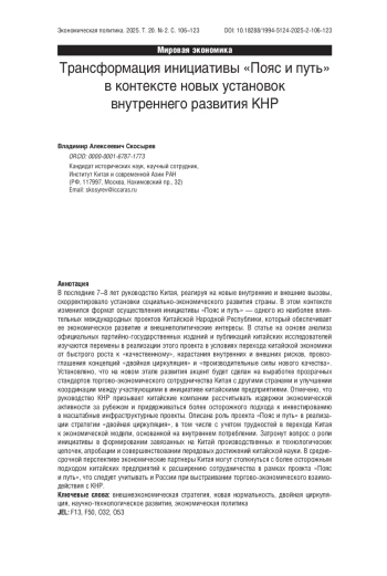 СКОСЫРЕВ В. А. ТРАНСФОРМАЦИЯ ИНИЦИАТИВЫ «ПОЯС И ПУТЬ» В КОНТЕКСТЕ НОВЫХ УСТАНОВОК ВНУТРЕННЕГО РАЗВИТИЯ КНР // ЭКОНОМИЧЕСКАЯ ПОЛИТИКА. 2025. ТОМ 20, № 2