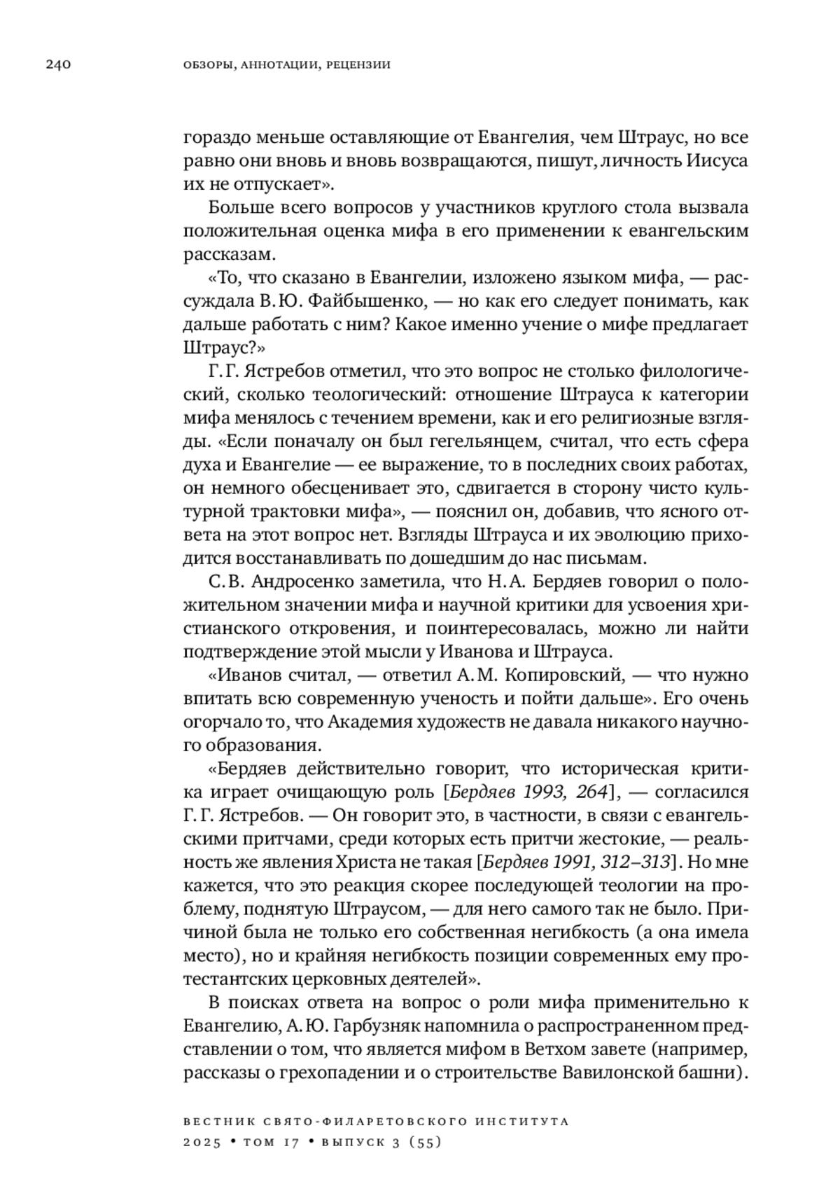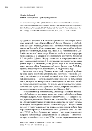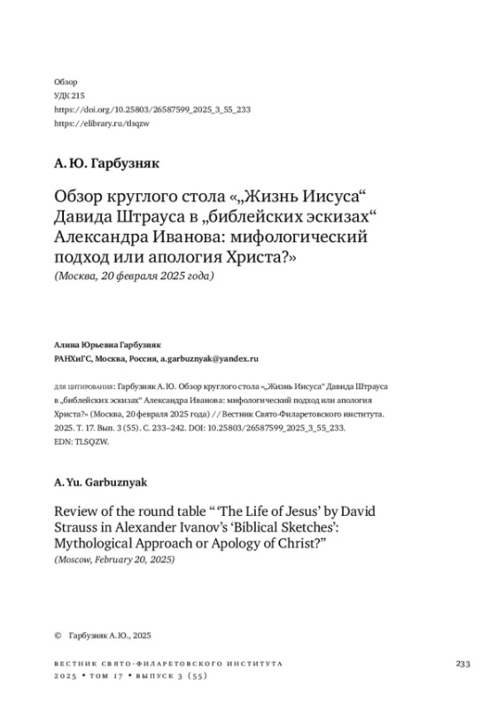 Двадцатого февраля в Свято-Филаретовском институте состоялся круглый стол «„Жизнь Иисуса“ Давида Штрауса в „библейских эскизах“ Александра Иванова: мифологический подход или апология Христа?». С докладами выступили ректор Свято-Филаретовского института, канд. пед. наук А. М. Копировский («„Библейские эскизы“ Александра Иванова — богословие внутри религиоведения») и старший преподаватель института, библеист Г. Г. Ястребов («Давид Штраус: личность и его радикальная теория: современный взгляд»). В обсуждении приняли участие канд. филол. наук Е. А. Полякова, канд. филос. наук В. Ю. Файбышенко, канд. мед. наук Б. А. Воскресенский, канд. филол. наук А. Ю. Гарбузняк, пресс-секретарь института С. В. Андросенко и др.