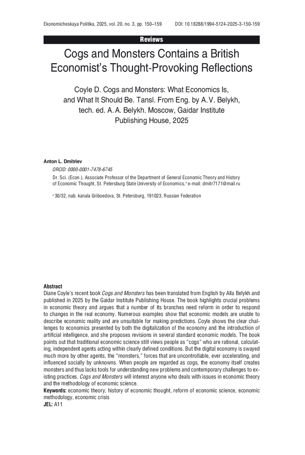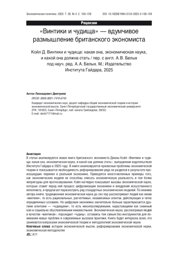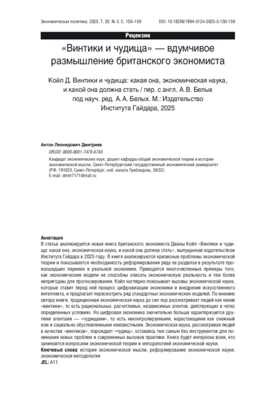 ДМИТРИЕВ А. Л. «ВИНТИКИ И ЧУДИЩА» — ВДУМЧИВОЕ РАЗМЫШЛЕНИЕ БРИТАНСКОГО ЭКОНОМИСТА // ЭКОНОМИЧЕСКАЯ ПОЛИТИКА. 2025. ТОМ 20, № 3
