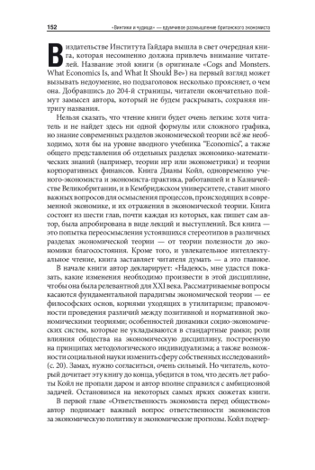 В статье анализируется новая книга британского экономиста Дианы Койл «Винтики и чудища: какая она, экономическая наука, и какой она должна стать», выпущенная издательством Института Гайдара в 2025 году. В книге анализируются кризисные проблемы экономической теории и показывается необходимость реформирования ряда ее разделов в результате произошедших перемен в реальной экономике. Приводятся многочисленные примеры того, как экономические модели не способны описать экономическую реальность и тем более непригодны для прогнозирования. Койл наглядно показывает вызовы экономической науке, которые ставит перед ней процесс цифровизации экономики и внедрения искусственного интеллекта, и предлагает пересмотреть ряд стандартных экономических моделей. По мнению автора книги, традиционная экономическая наука до сих пор рассматривает людей как некие «винтики», то есть рациональных, расчетливых, независимых агентов, действующих в четко определенных условиях. Но цифровая экономика значительно больше характеризуется другими агентами — «чудищами», то есть неконтролируемыми, нарастающими как снежный ком и социально обусловленными неизвестными. Экономическая наука, рассматривая людей в качестве «винтиков», порождает «чудищ», оставаясь тем самым без инструментов для понимания новых проблем и современных вызовов практики. Книга будет интересна всем, кто занимается вопросами экономической теории и методологией экономической науки.