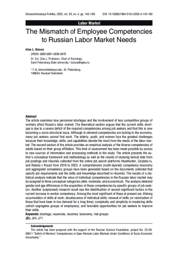 В статье рассматриваются вопросы дефицита кадров и вовлечения в трудовую деятельность менее конкурентных на рынке труда групп. В теоретической части указывается, что нехватка кадров по крайней мере частично может быть связана с кризисом компетентности соискателей, который в настоящее время приобретает социально-структурный характер. Проблемы возникают у лиц пожилого возраста, молодежи и женщин, чьи знания, умения и навыки в наибольшей степени отличаются от потребностей рынка труда. В статье приводятся результаты эмпирического анализа компетенций соискателей на основе их групповой принадлежности. Оценка базируется на привлечении в исследование новых источников информации и использовании новых методов их обработки. Представлены авторские концепция, техническая методология и результаты изучения текстовых данных вакансий и резюме, собранных с онлайн-площадок по поиску работы Headhunter, Zarplata. ru, «Работа в России», за период с 2019 по 2023 год. На базе полученной коллекции документов, содержащих требования к соискателям и навыки/знания, записанные в резюме, разработана комплексная (многослойная) таксономия компетенций и определены их укрупненные группы. На основании определения стоимости отдельных компетенций выделены и охарактеризованы элитные, умеренные и экономные компетенции. Выявлено, что на российском рынке труда больше распространены недорогие компетенции. Половозрастные различия соискателей в овладении компетенциями приводят к эффекту смещения вниз по шкале неравенства для молодежи, женщин и пожилых лиц. Побочным (незапланированным) итогом стало обнаружение нескольких значимых эффектов, сопровождающих повышение компетентности работников. В настоящее время к наиболее значимым относятся следующие: накопление компетенций в течение трудовой жизни, устаревание отдельных компетенций, обновление компетенций (или валоризация долгое время маловостребованных компетенций), сложность и простота в овладении отдельными компетенциями (что разделяет группы работников), благоприятные возможности для соискателей в повышении квалификации.