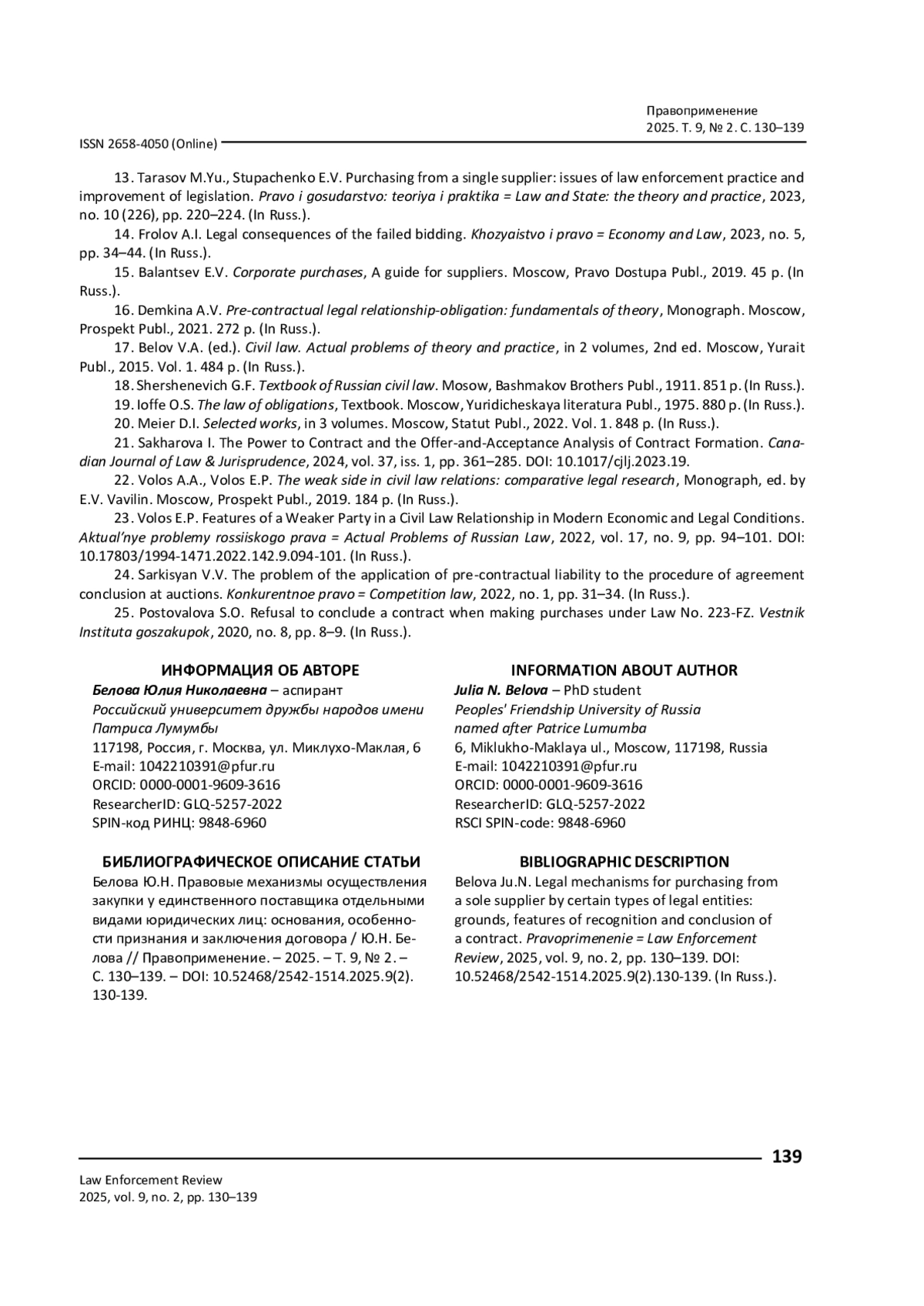 13. Тарасов М. Ю. Закупка у единственного поставщика: вопросы правоприменительной практики и совершенствования законодательства / М. Ю. Тарасов, Е. В. Ступаченко // Право и государство: теория и практика. - 2023. - № 10 (226). - С. 220-224.