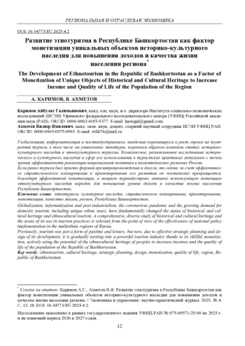 10. Каримов А.Г., Ахметов В.Я. Проектирование развития этнотуризма в РБ для монетизации уникальных объектов культурного наследия и повышения качества жизни населения региона // Инновационные технологии управления социально-экономическим развитием регионов России: материалы XVII Междунар. научно-практич. конф., посвящ. памяти академика АН РБ, д.э.н., проф. Исянбаева М.Н. Часть II. Уфа: ИСЭИ УФИЦ РАН, 2025. С. 65-71. EDN: TWVCSY