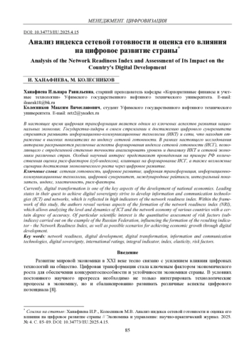 В настоящее время цифровая трансформация является одним из ключевых аспектов развития национальных экономик. Государства-лидеры в своем стремлении к достижению цифрового суверенитета стремятся развивать информационно-коммуникационные технологии (ИКТ) и сети, что находит отражение в высоких показателях по индексу сетевой готовности. В рамках настоящего исследования авторами раскрываются различные аспекты формирования индекса сетевой готовности (ИСГ), позволяющего с определенной степенью точности анализировать уровень и динамику ИКТ и сетевой экономики различных стран. Особый научный интерес представляет проведенная на примере РФ количественная оценка риск-факторов (суб-индексов), влияющих на формирование ИСГ, а также возможные сценарии достижения экономического роста через цифровое развитие
