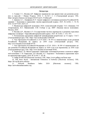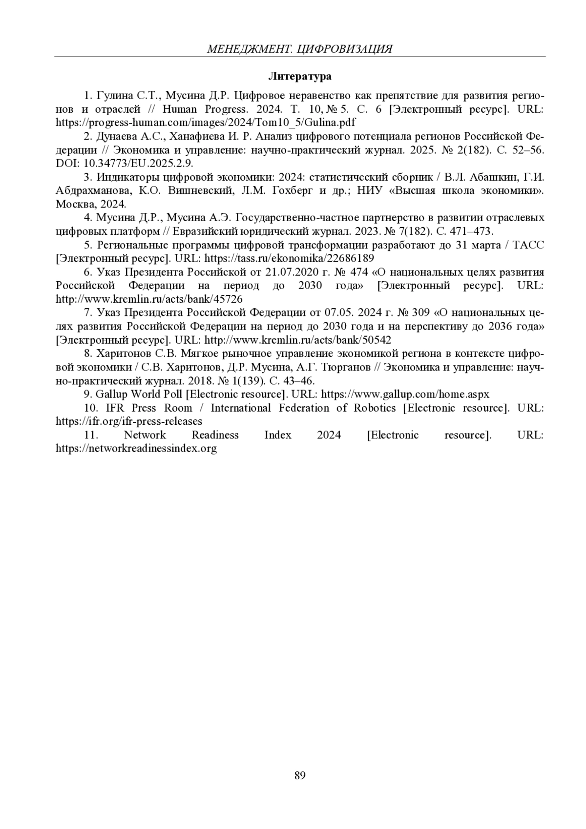1. Гулина С.Т., Мусина Д.Р. Цифровое неравенство как препятствие для развития регионов и отраслей // Human Progress. 2024. Т. 10, № 5. С. 6 [Электронный ресурс]. URL: https://progress-human.com/images/2024/Tom10_5/Gulina.pdf. EDN: MQTXKL