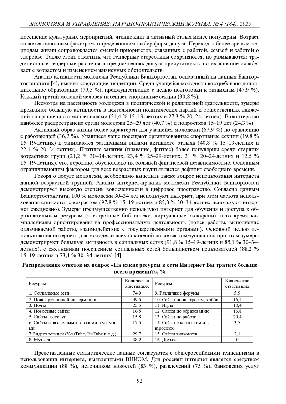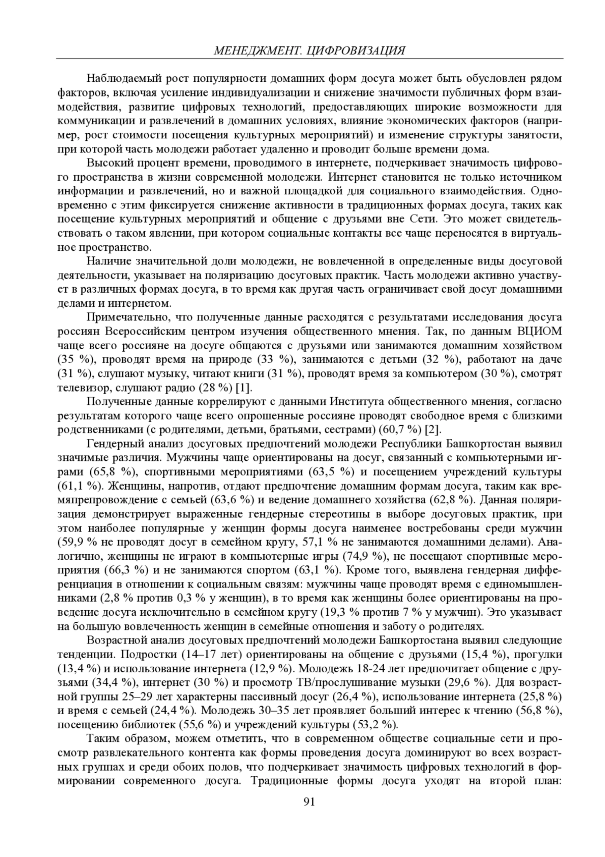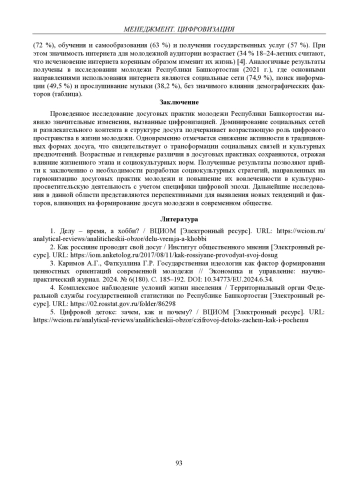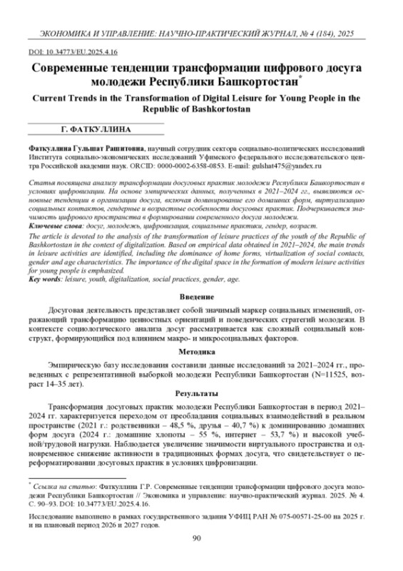 Статья посвящена анализу трансформации досуговых практик молодежи Республики Башкортостан в условиях цифровизации. На основе эмпирических данных, полученных в 2021–2024 гг., выявляются основные тенденции в организации досуга, включая доминирование его домашних форм, виртуализацию социальных контактов, гендерные и возрастные особенности досуговых практик. Подчеркивается значимость цифрового пространства в формировании современного досуга молодежи